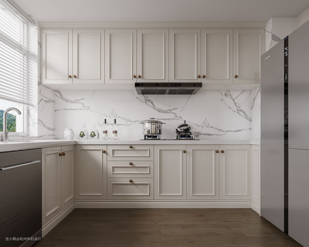 厨房的空间不大,L型的厨房可以最大限度地利用空间,颜色的选择上以干净明亮为主。通体纯白的橱柜与大理石墙面形成了错落有致的层次感,彰显出了空间简单大方的空间氛围。在转角处安装转角柜,扩容的问题轻松解决。