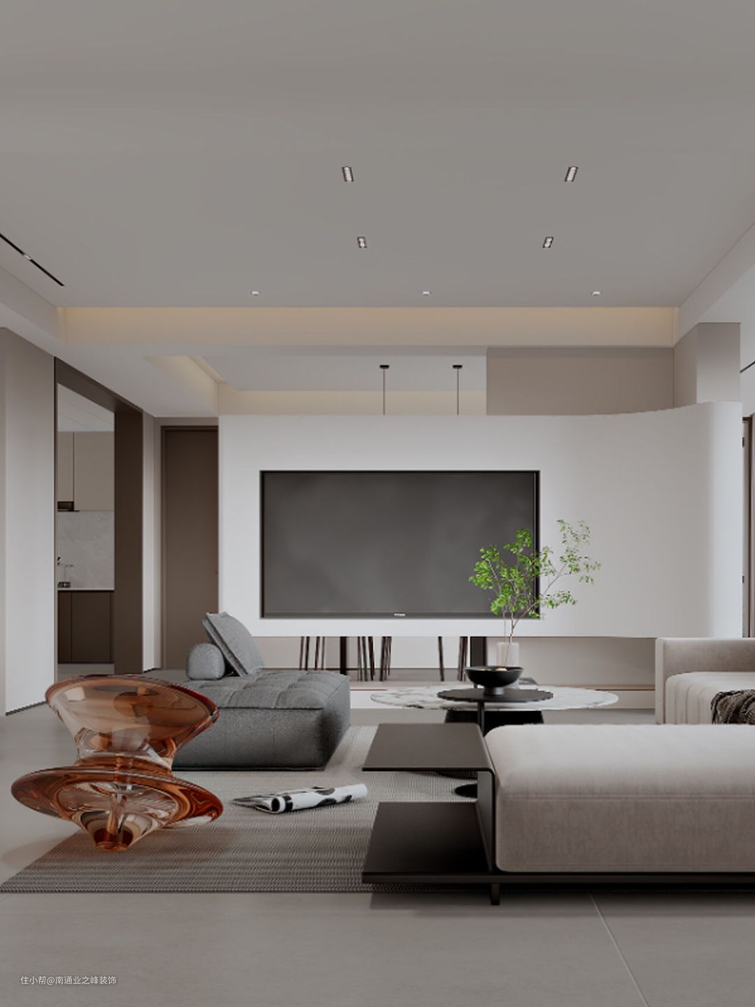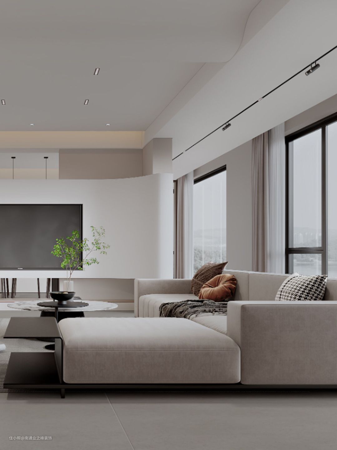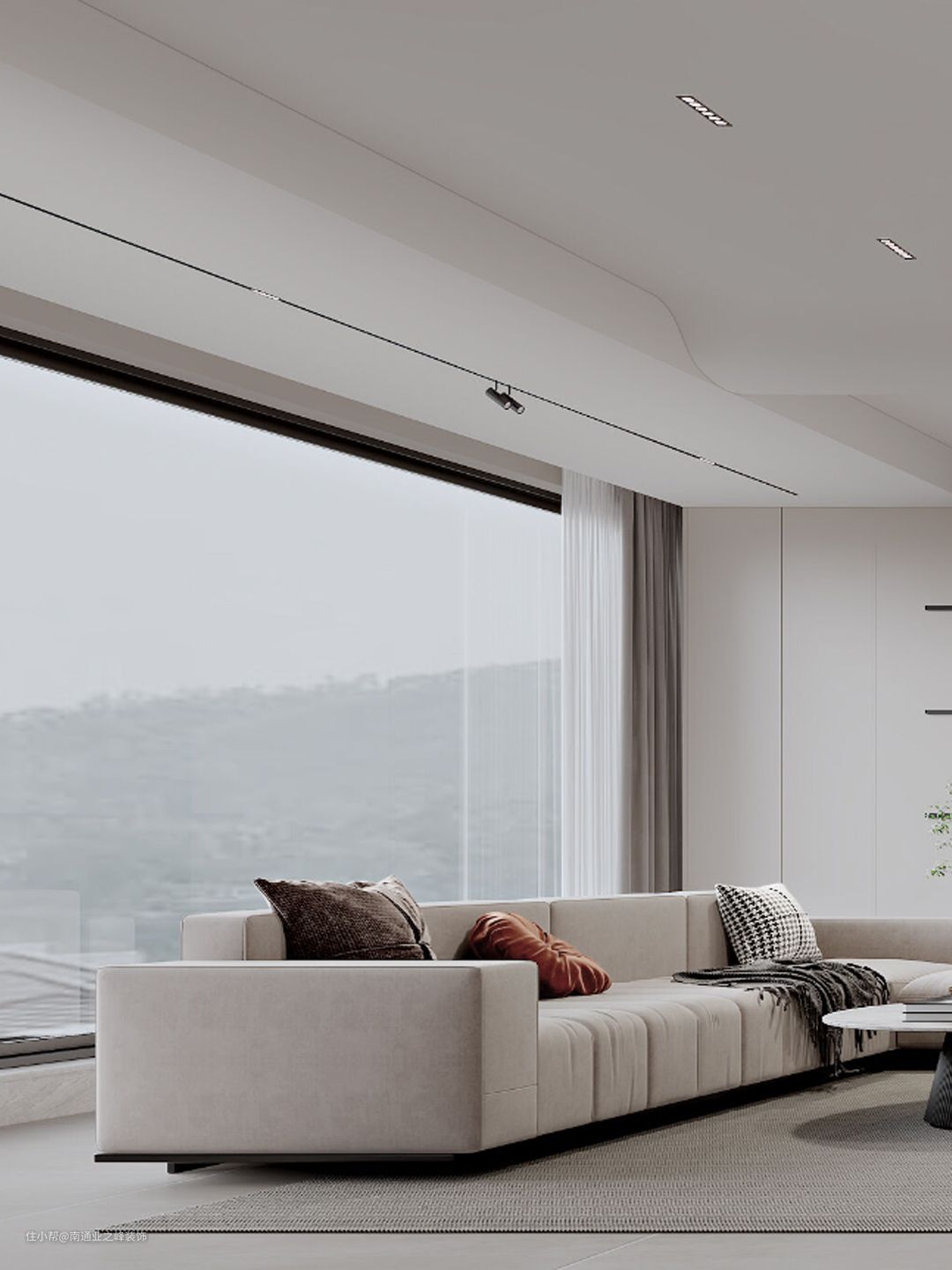 🎨客厅无主灯设计搭配温柔浅淡的暖白色调🪄 600*1200的柔光砖通铺与超大落地窗相协调 卷轴式悬浮电视背景墙与沙发背景墙柜体弧形造型的呼应🖼 这些元素无一不体现现代极简在居所中所释放的魅力