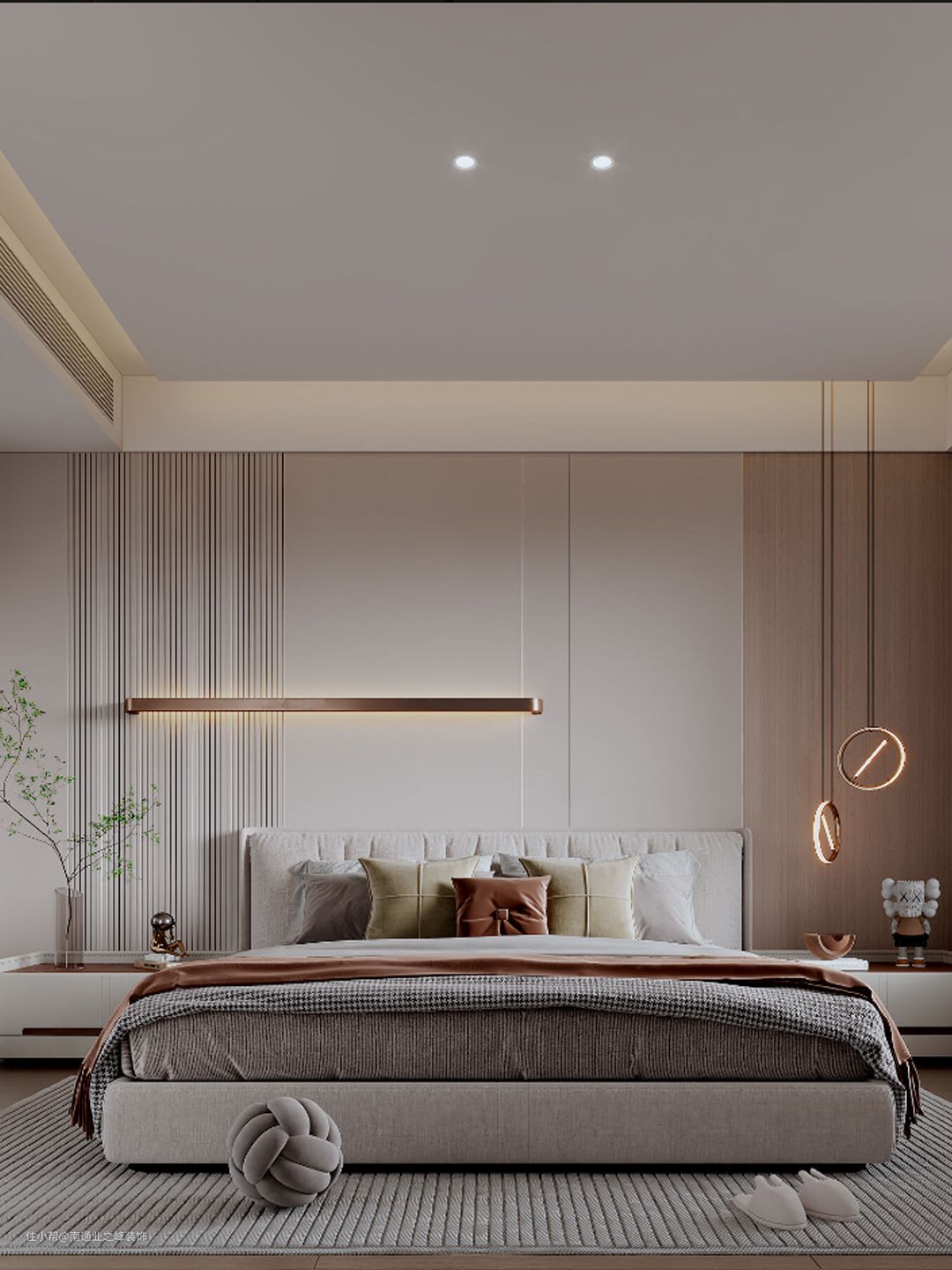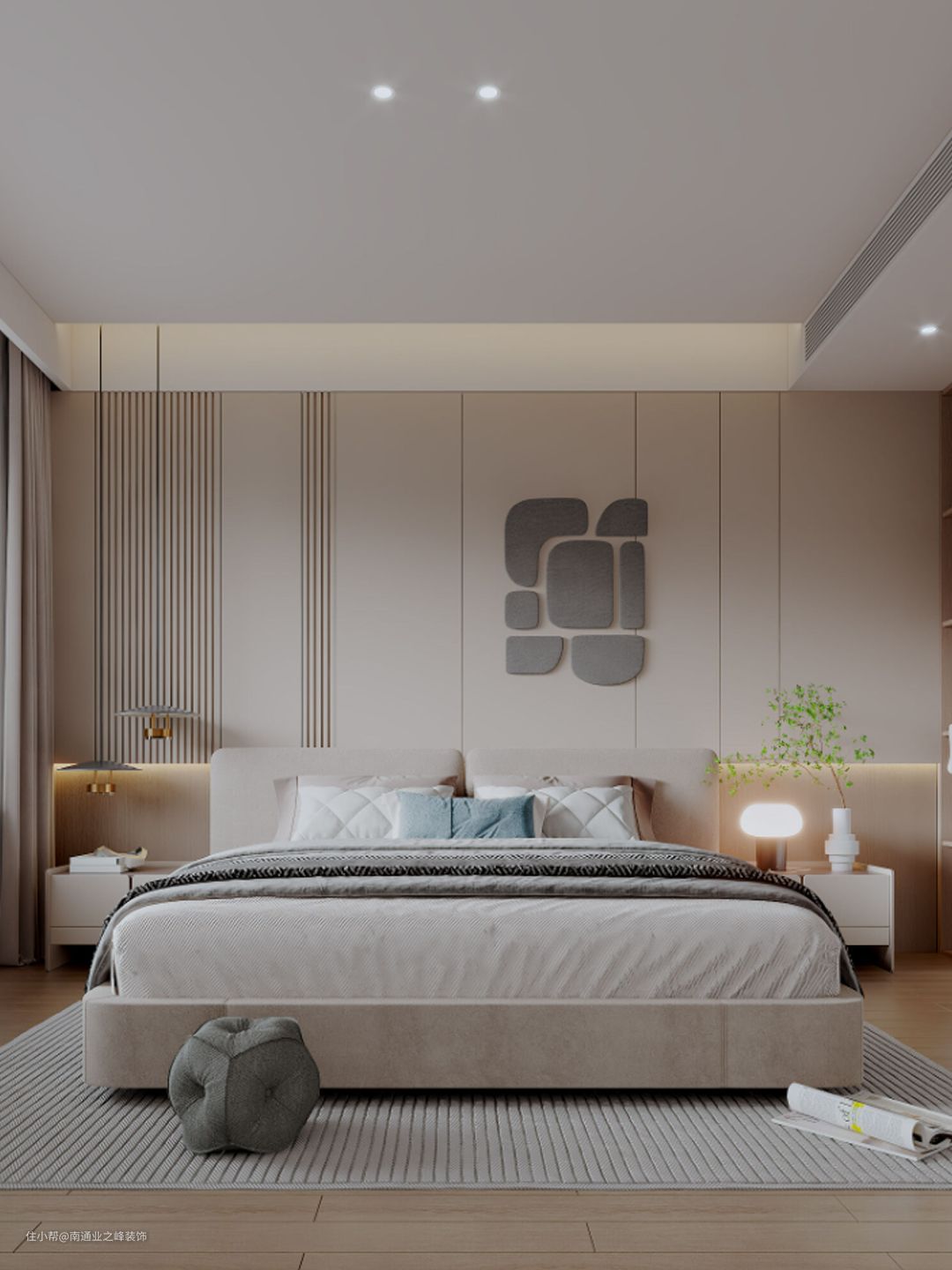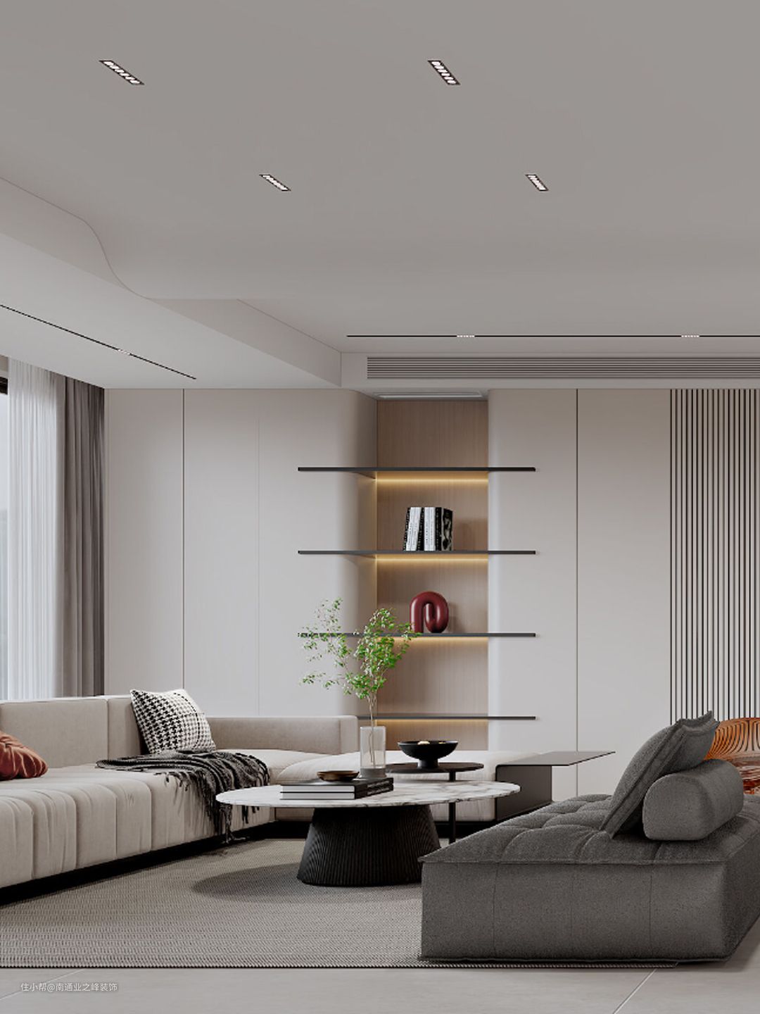 🎨客厅无主灯设计搭配温柔浅淡的暖白色调🪄 600*1200的柔光砖通铺与超大落地窗相协调 卷轴式悬浮电视背景墙与沙发背景墙柜体弧形造型的呼应🖼 这些元素无一不体现现代极简在居所中所释放的魅力