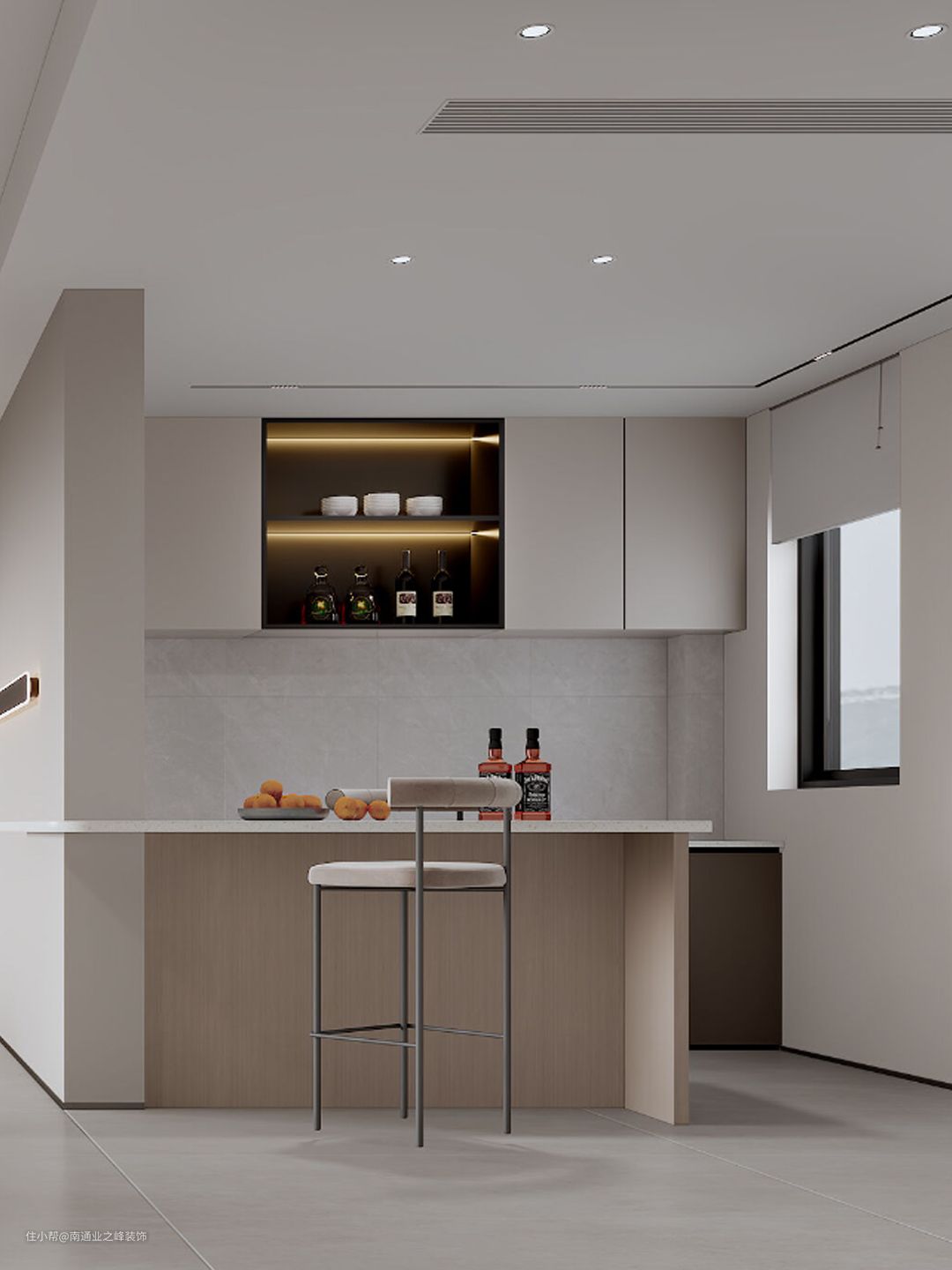🎨穿过入户区域,设置了橱柜和吧台 同时将一些厨房电器放置在这里 既可以延伸厨房功能满足蒸烤等电器的操作需求🥘