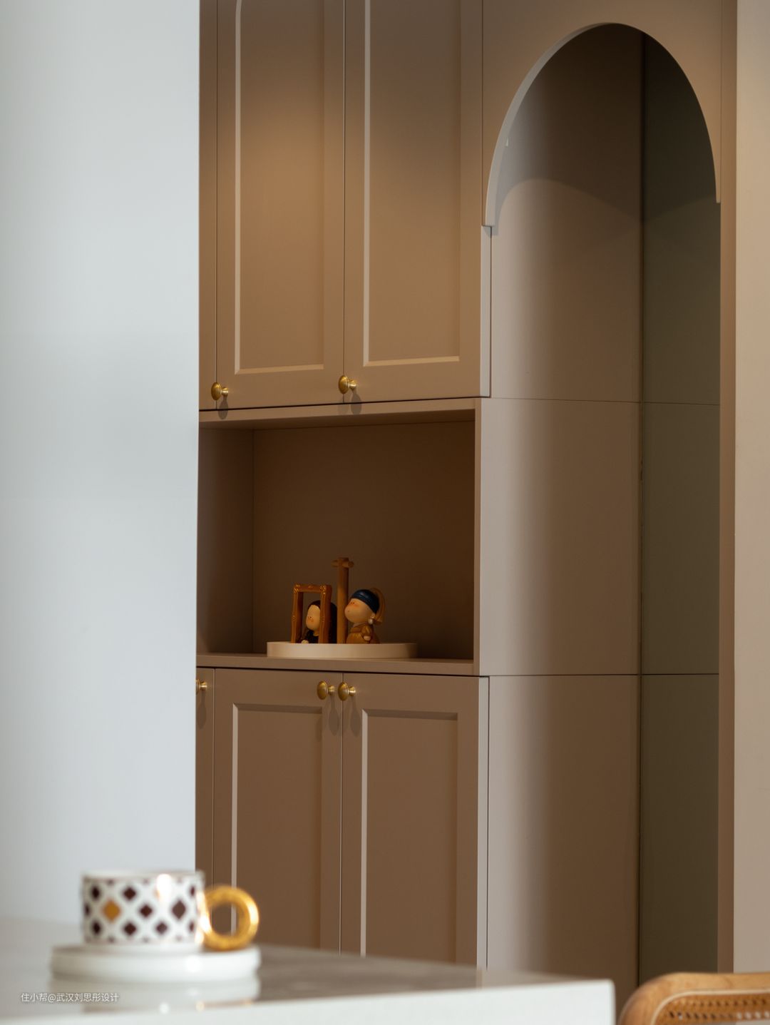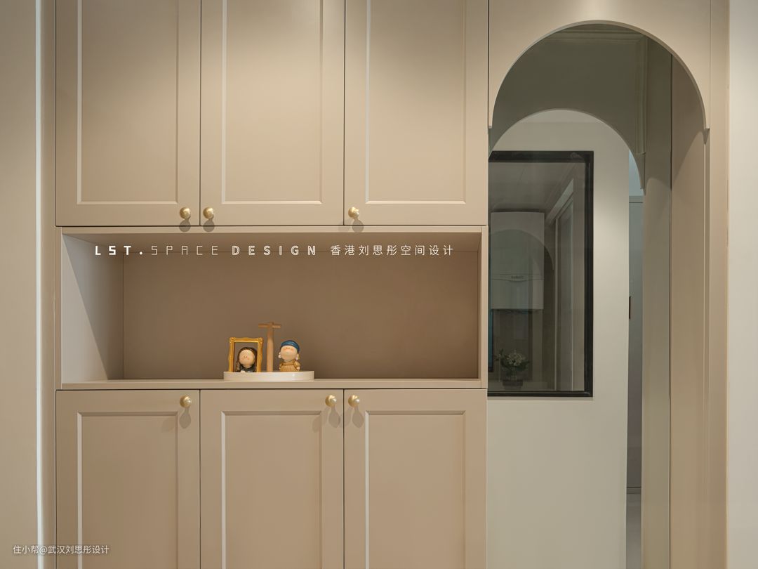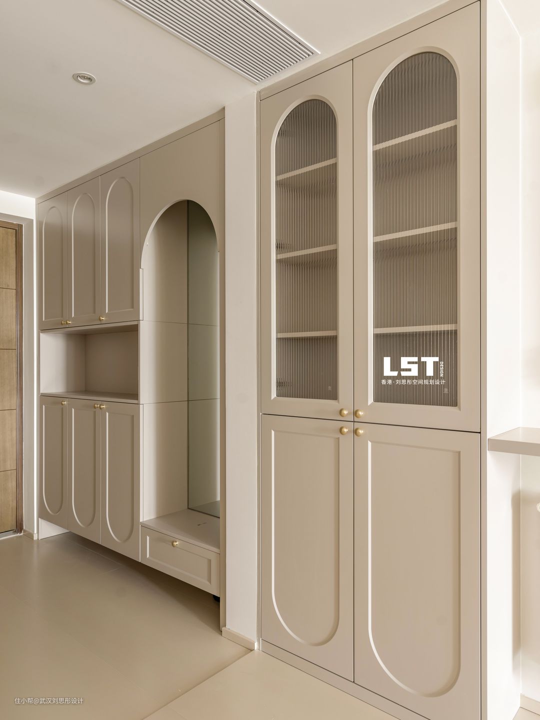 奶茶色柜门柔和细腻,搭配弧形元素和3500k氛围灯光,进门时让人感觉舒缓治愈回家氛围!