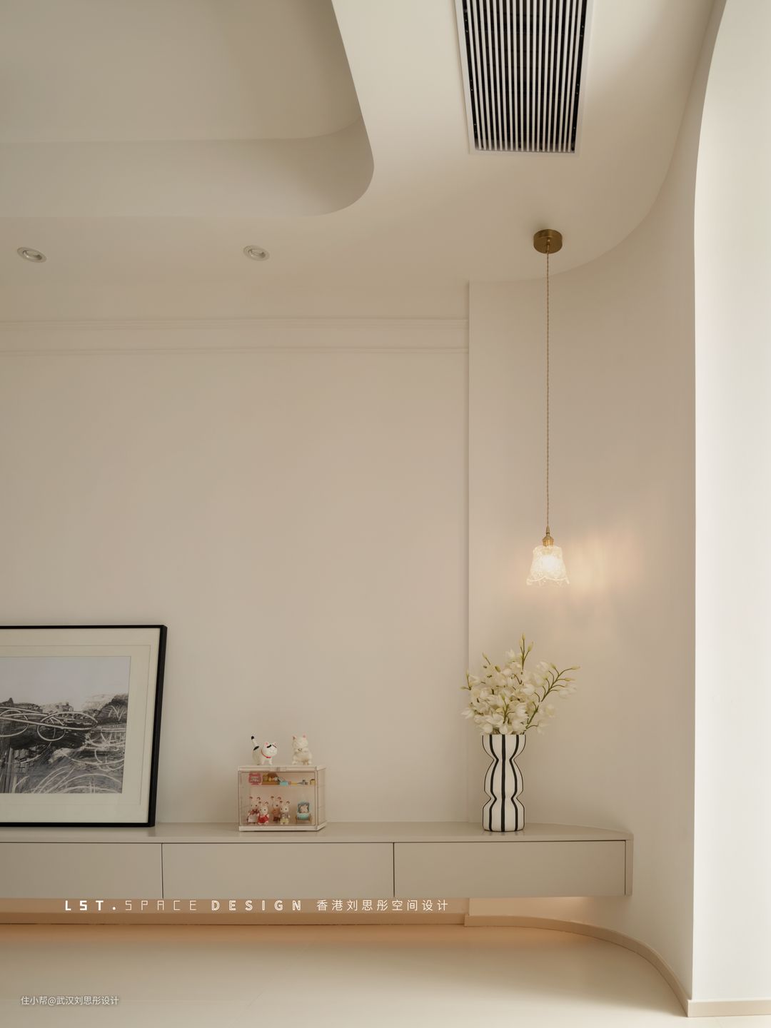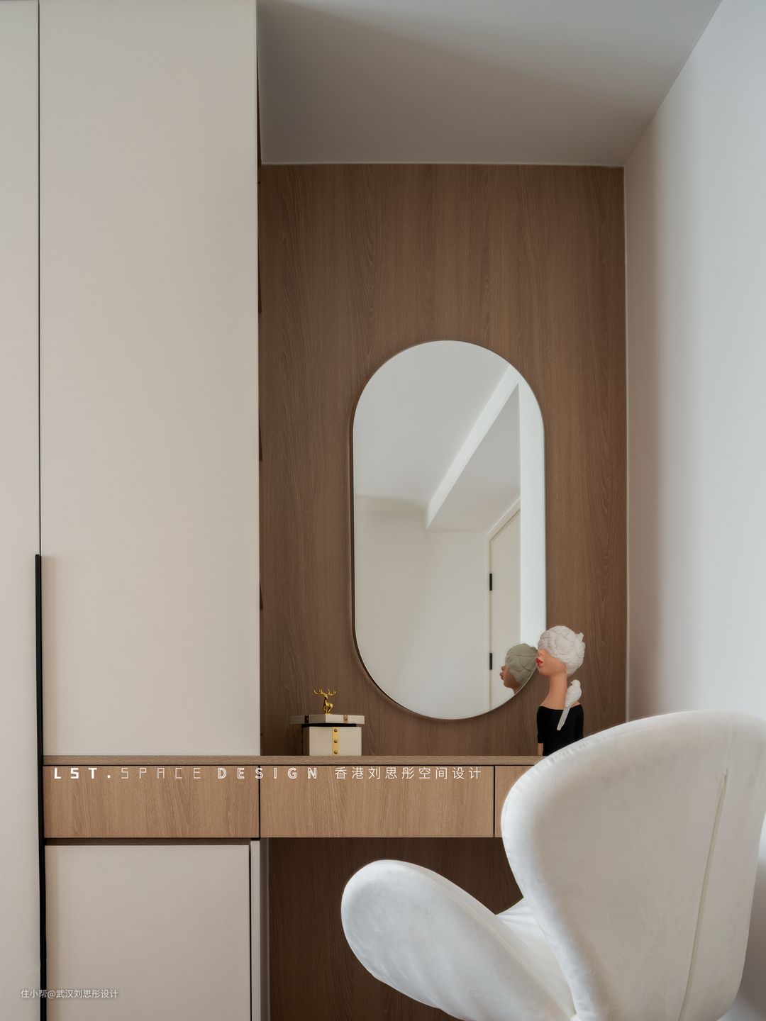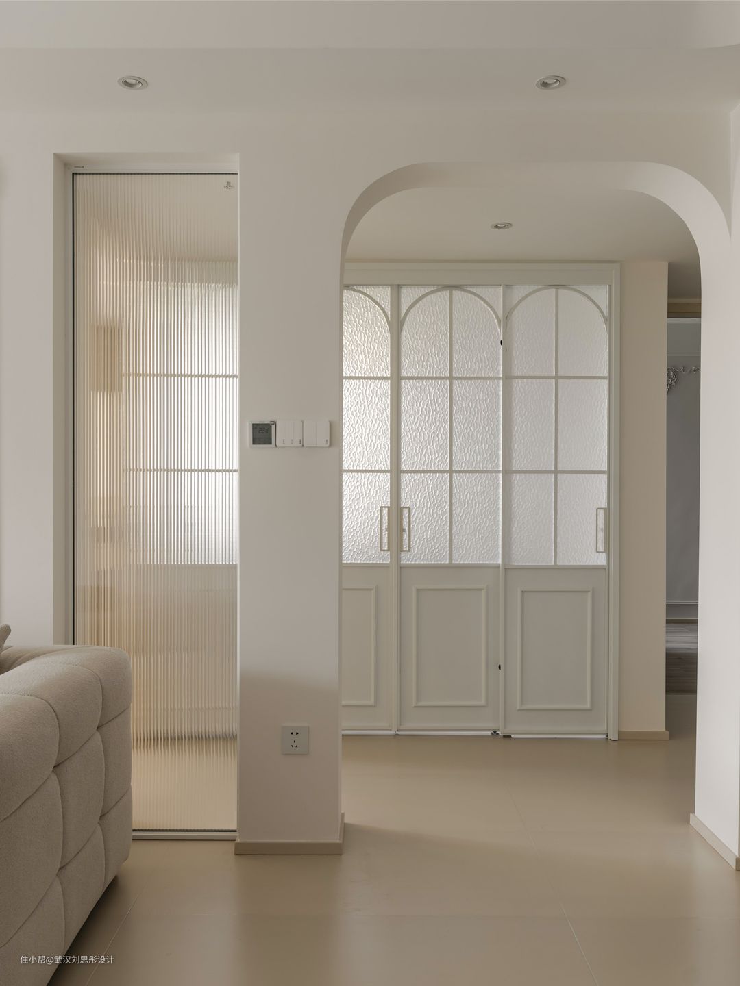 奶茶色柜门柔和细腻,搭配弧形元素和3500k氛围灯光,进门时让人感觉舒缓治愈回家氛围!