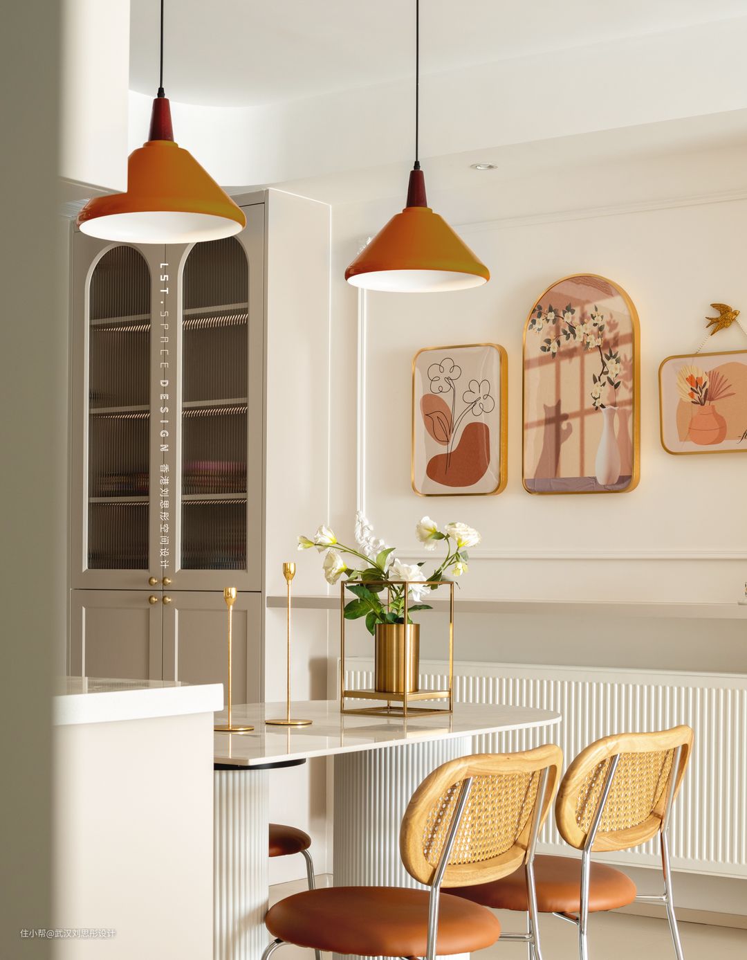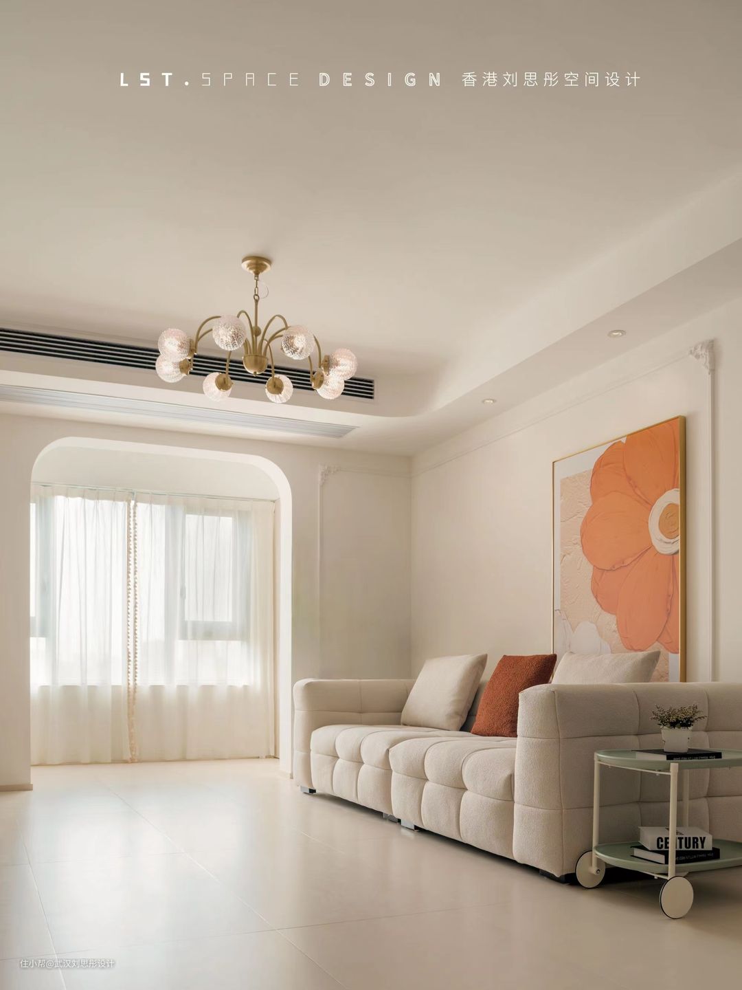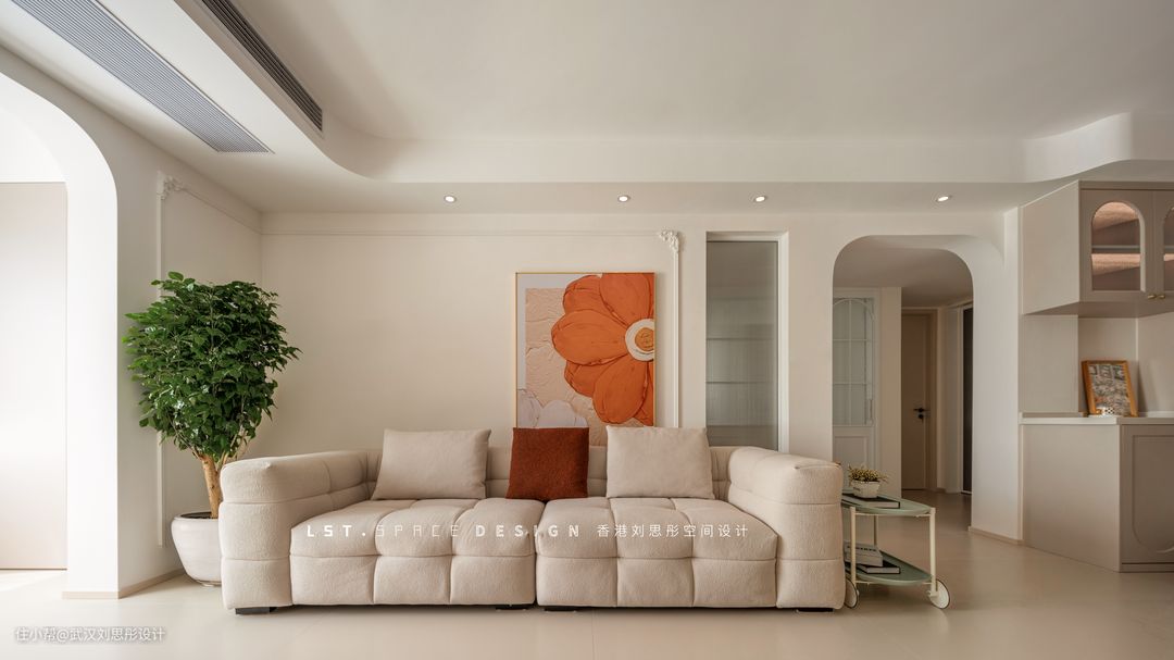 沙发背景采用石膏线条与圆弧元素进行结合,搭配绿植与明媚的装饰画,优雅与质朴共存,营造了一种愉悦而悸动的氛围。