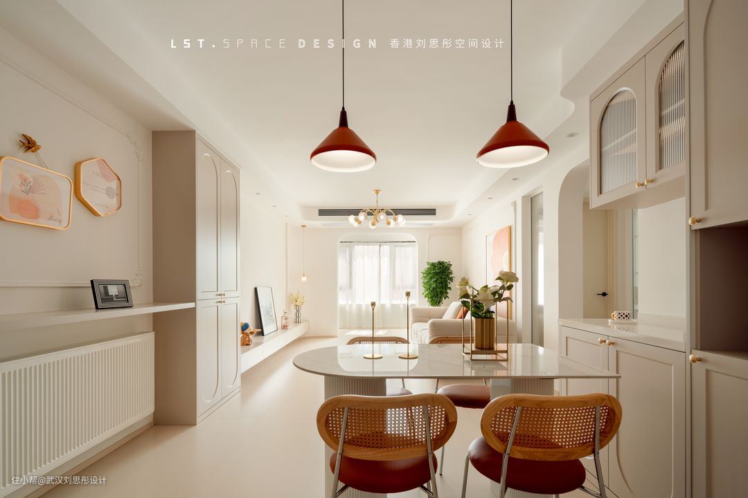 从餐厅看向客厅,足够的宽敞度及曼妙的自然阳光,营造出细腻、温柔的惬意氛围。 餐厅以悬浮层板的形式处理柜体的衔接与收纳关系。不仅避免暖气片的突兀,也让家居氛围把握的张弛有度。