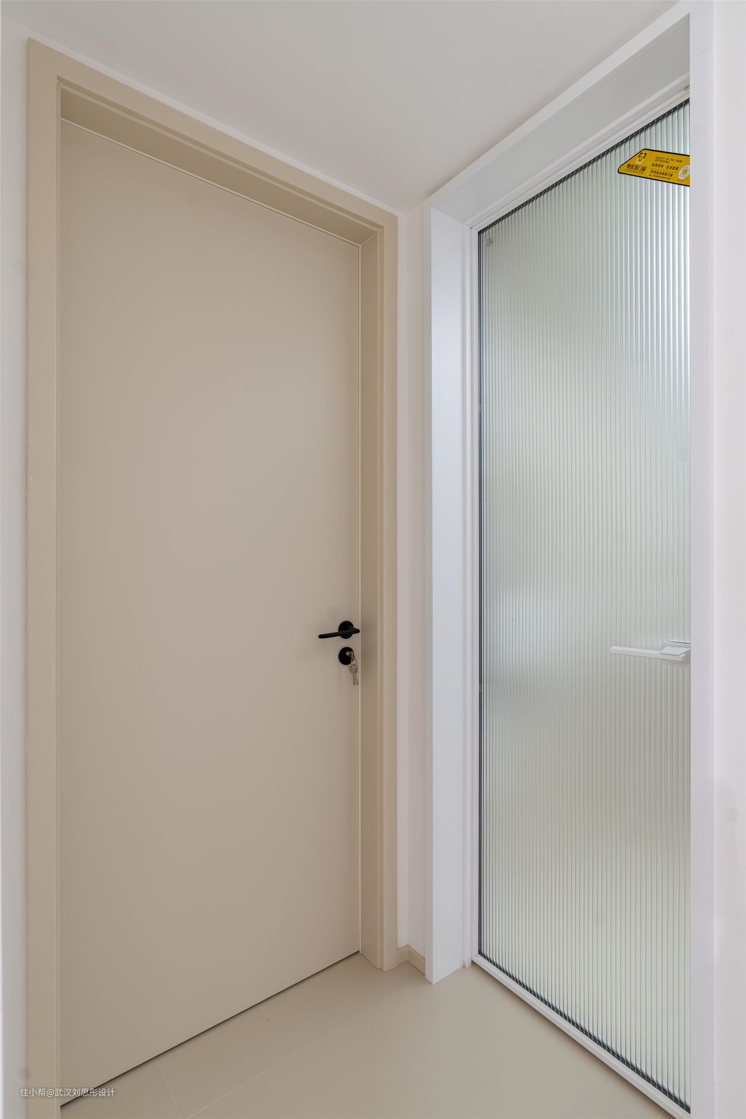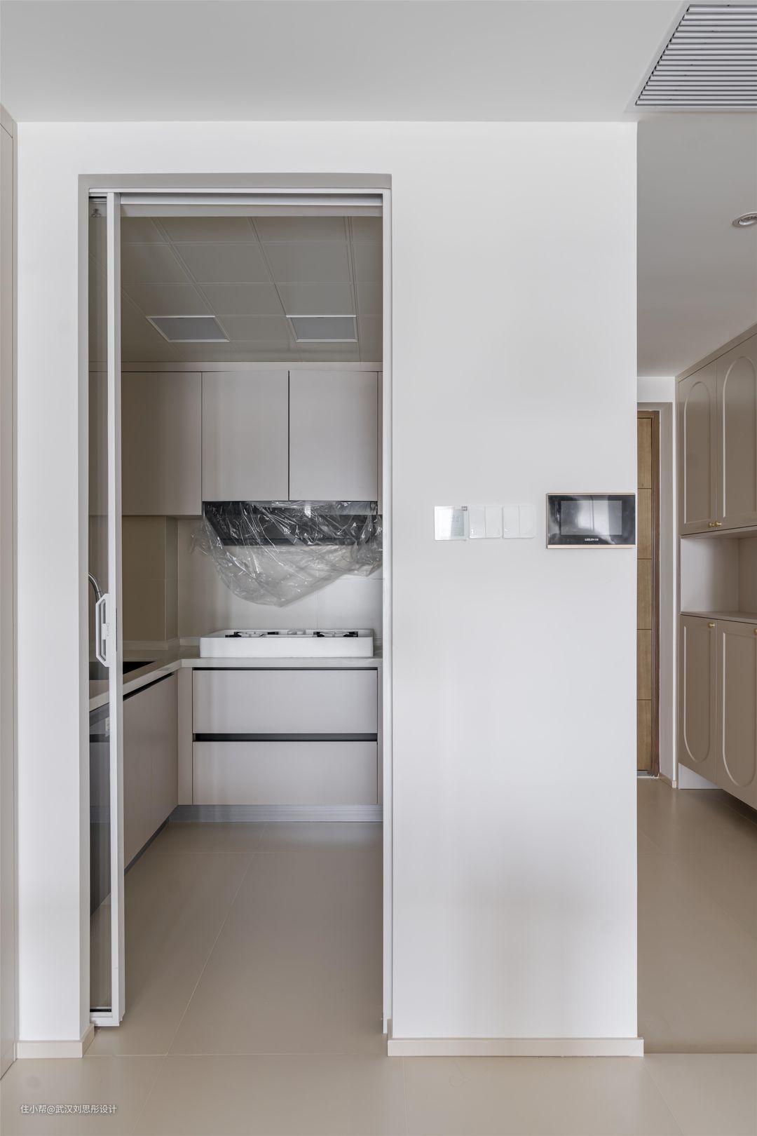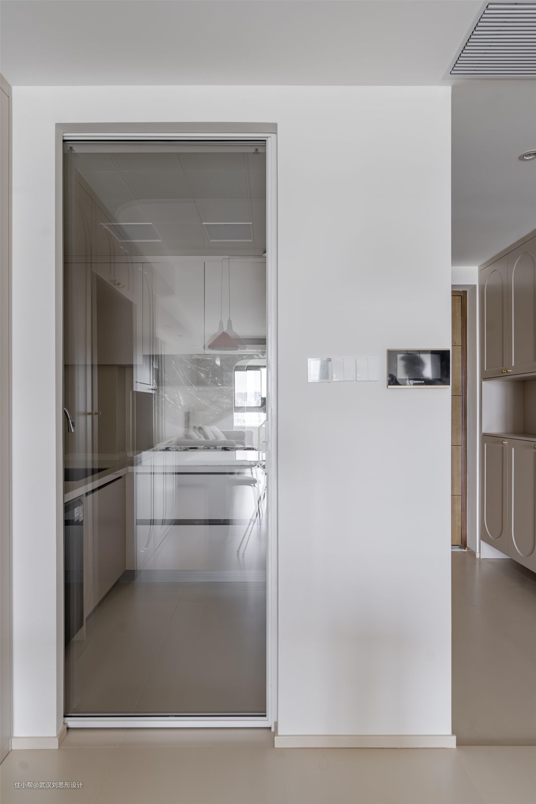 厨房门采用通透的玻璃内梭门,白色极窄边框极简流畅,有效隔绝油烟。