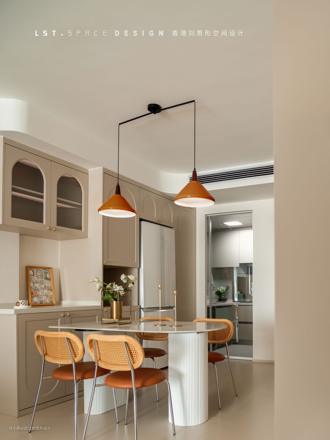 餐边柜嵌入冰箱,并将储物与圆弧形餐桌以简洁的几何体块形成呼应与统一。