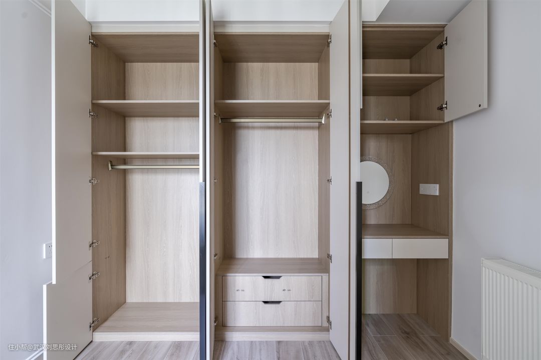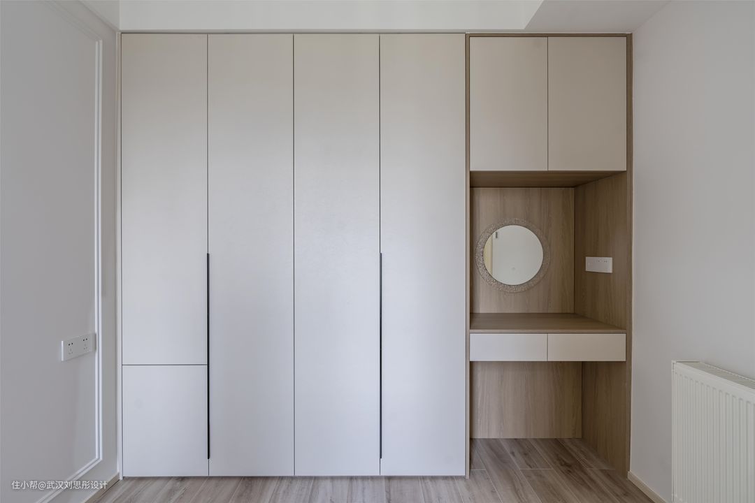 主卧纯粹素净,使用沉浸舒缓的沙色调,给予舒适与满满的安全感。 整面排柜一门到顶,简洁自然,并插入悬挑梳妆台,以和谐温婉的姿态契合其所在空间。