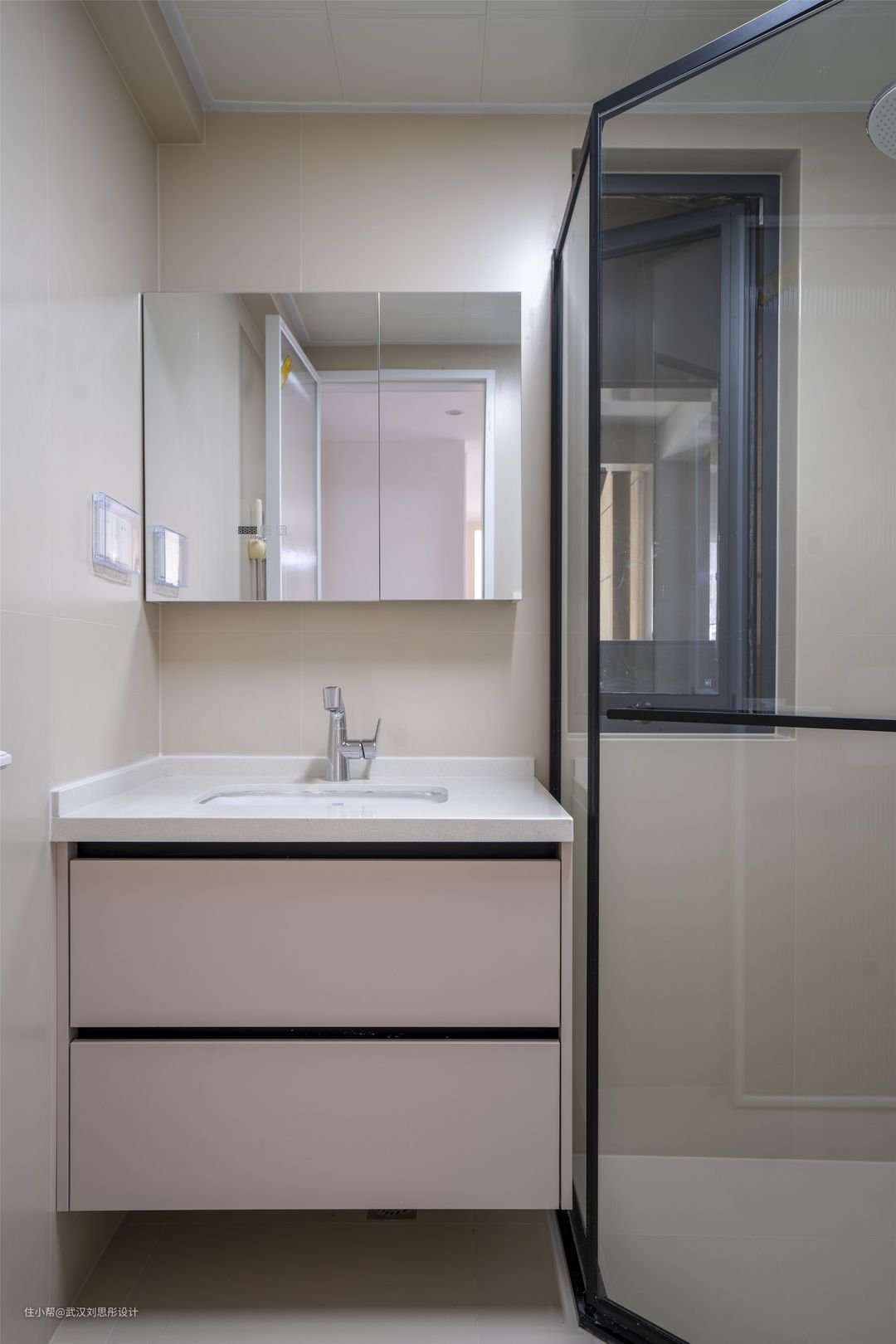 卫生间保持原始结构进行干湿分离,平衡其功能关系,统一色调与材质,形成低调却统一的视觉张力。