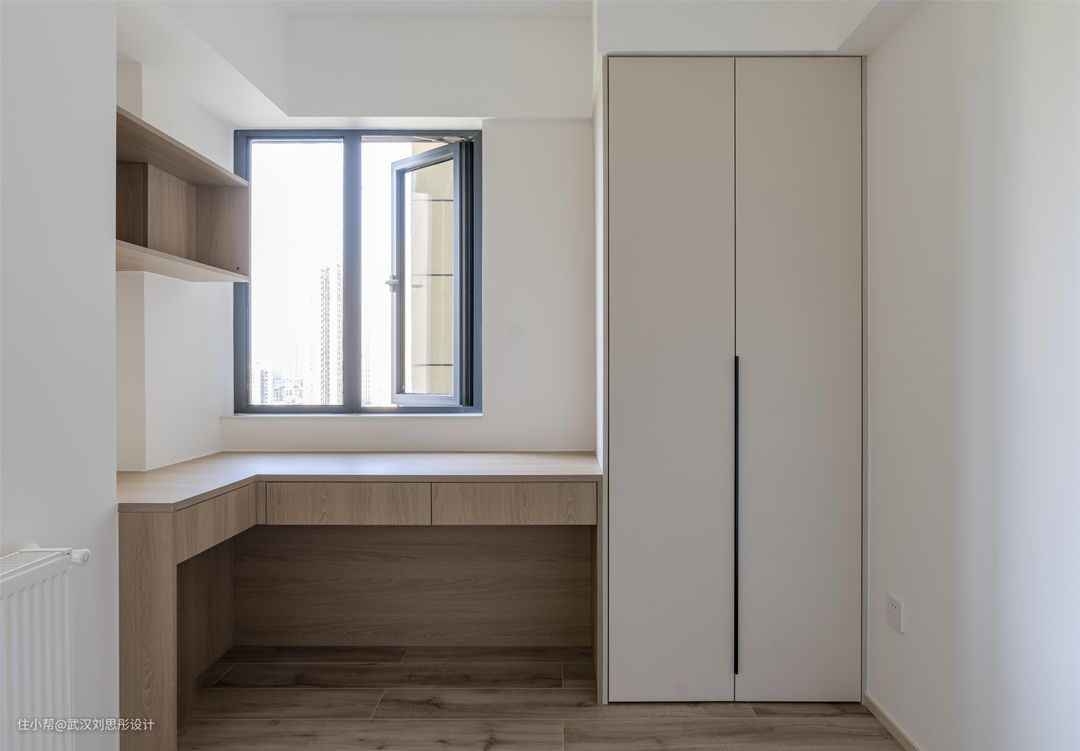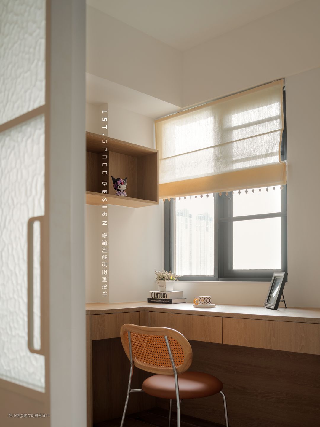 L形书桌靠窗摆放,阳光经过窗帘过滤,营造温馨自然的空间氛围。
