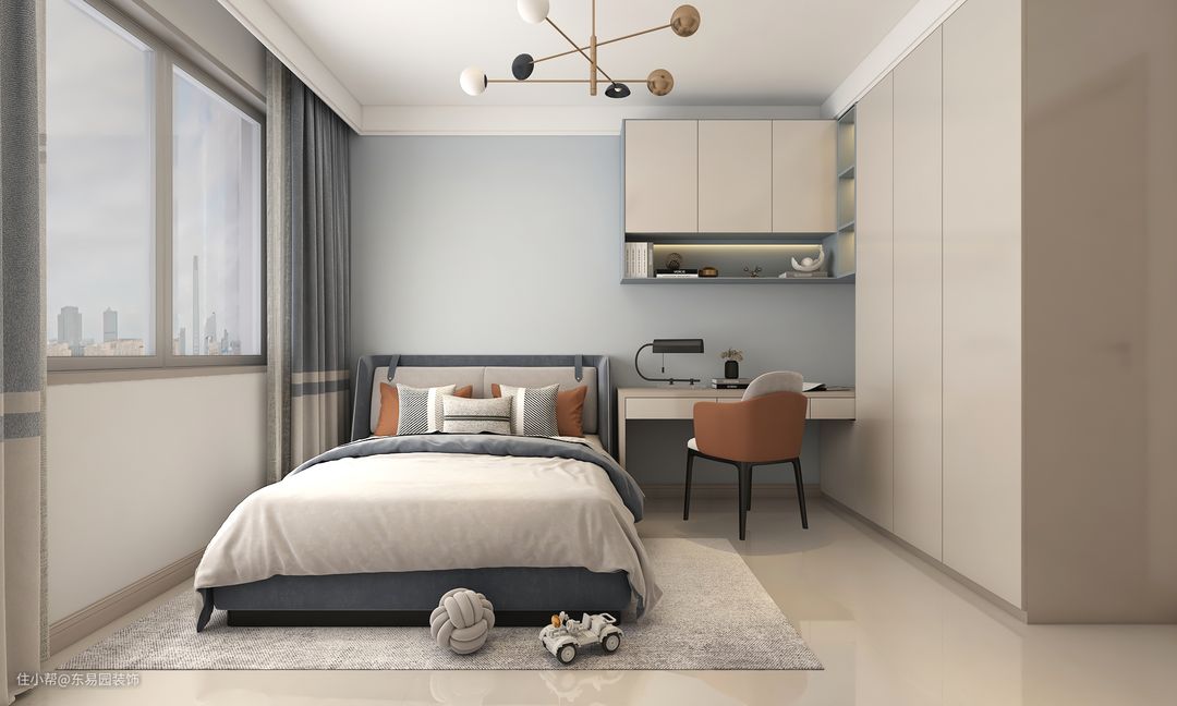 男孩房是蓝白色天空主题设计,背景墙的蓝色与白色相呼应。在空间右侧位置设计有学习桌,给孩子带去更多趣味知识,引发孩子的学习思考能力。