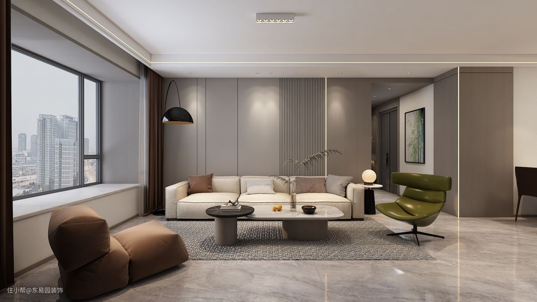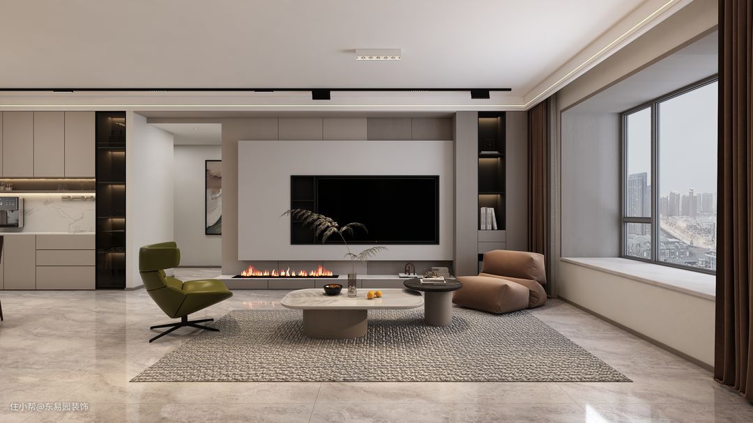 室内采用了中性色。墙壁、天花板和所有的储物空间,衣柜,都刷成了暖白色。再搭配木色的木制墙板材料,这个空间充满了经典元素。 客厅沙发墙家具的组合暗示着许多客人和你最亲密的朋友一起度过一个有趣的假期。设计并不是强迫,而是简单地给人一种舒适和温暖的感觉。 客厅空间须以直击人心的块面质感,营造郎阔纯粹的独特空间,形成一种如优质音乐般的抓耳前奏。灿烂阳光在整面窗帘的柔和遮挡下,形成光与影的立体质感。