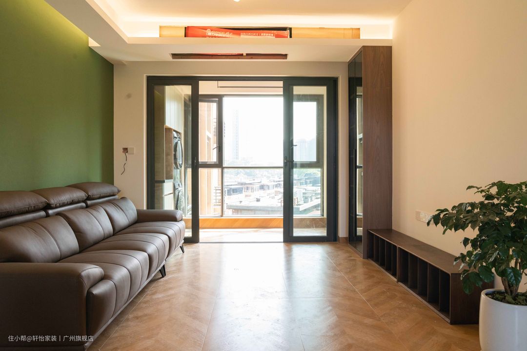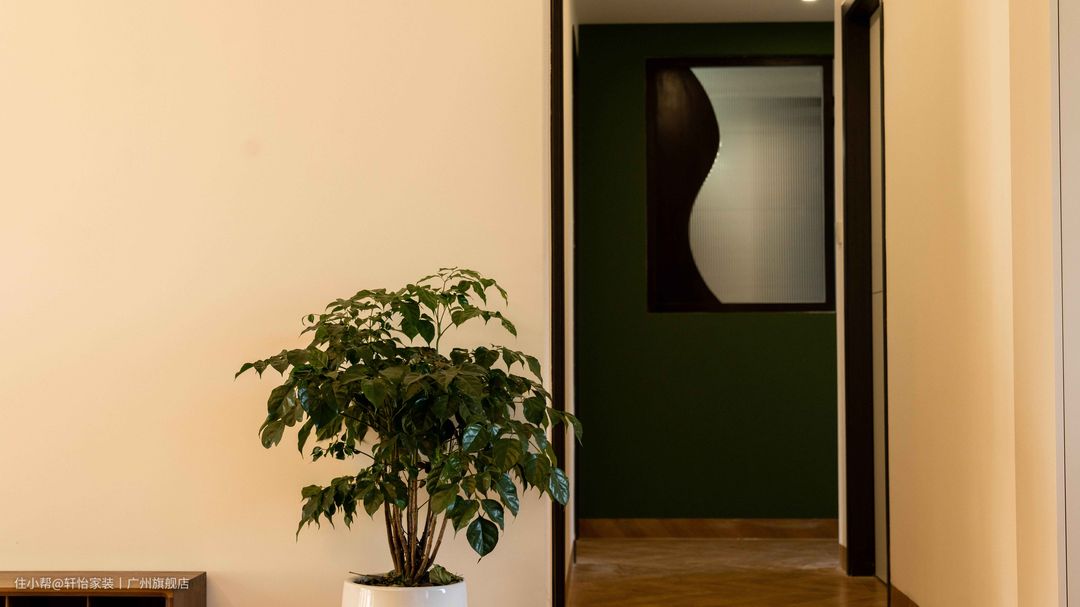 顶面有序的局部吊顶,伴随灯带以轻盈姿态跃入眼帘,传递出气质的独特。鱼骨拼花纹铺陈出空间的起承转合,开启居住者的探索序幕。巧克力色沙发线条与蓬松度交织,凸显工艺之美;迎向天花倾泻的柔光,带来几分别样意趣。而背景墙色仿佛从原有结构中渗透出,将空间带入苔藓般的潮湿感,成为古今的链接 。 抛弃传统电视柜制式,将地柜与通顶柜融合,带入灰玻新意,打破常规收纳布局,建立起新的空间秩序自带棕色氛围感的空间,呈现草木柔情般的质地,让烟火生活升起无尽诗意。