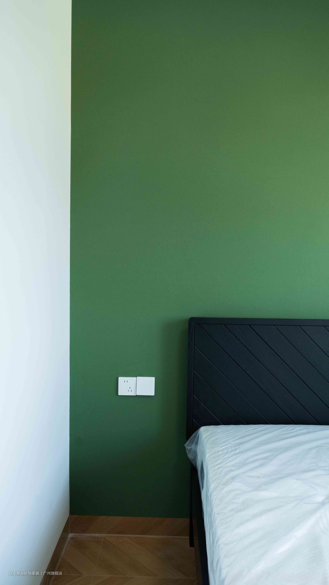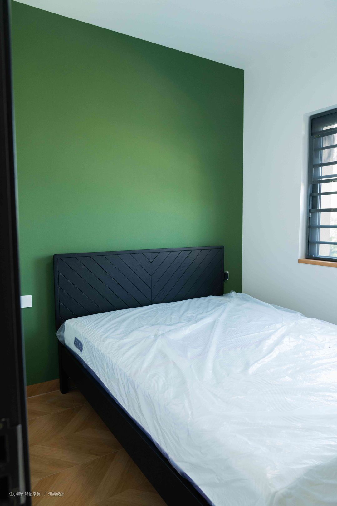次卧并未采用复杂设计,仅在元素上对整屋做呼应。简明有型,而风格永存。板状拼接的暗色床头、鱼骨拼、绿墙漆,透露出几分法式与复古。