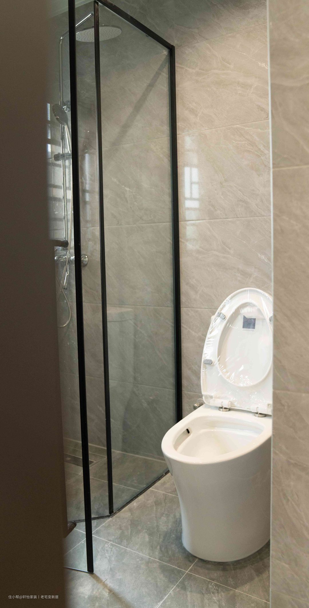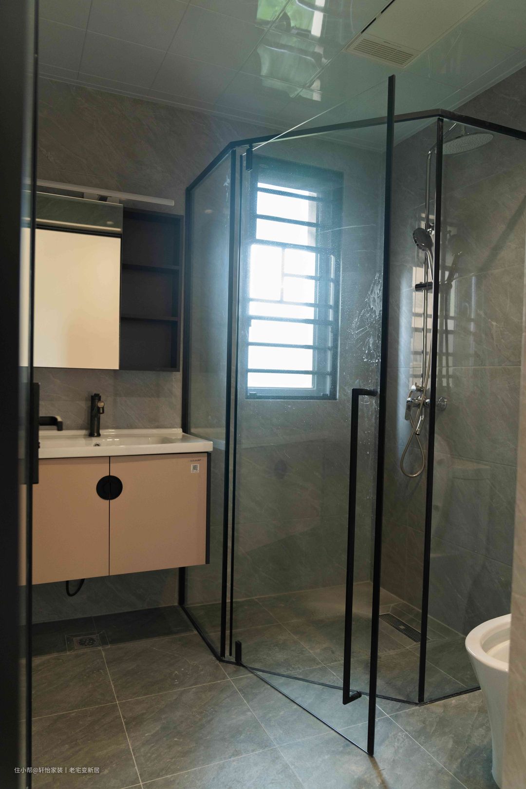L型布局+钻石淋浴房的黄金组合,让小方形空间也拥有干湿分离。淋浴房的外开式设计,保有内部使用宽敞,亦为意外铺垫一份安全。