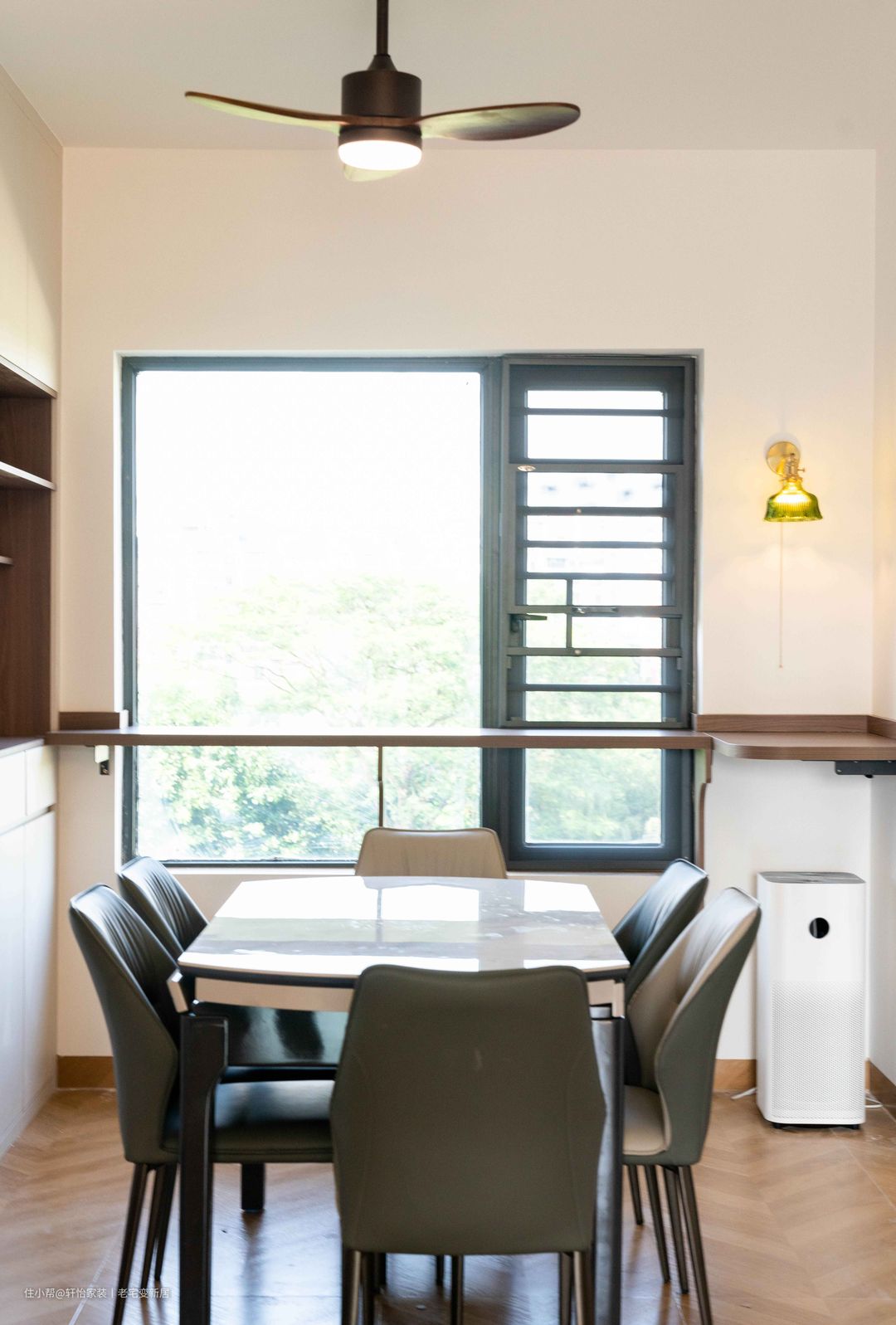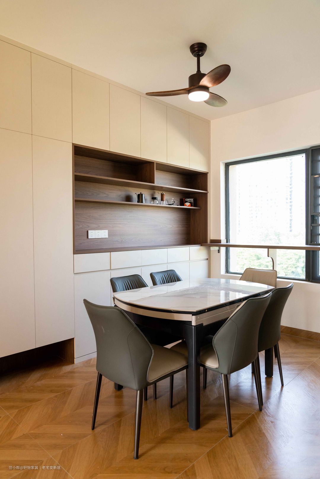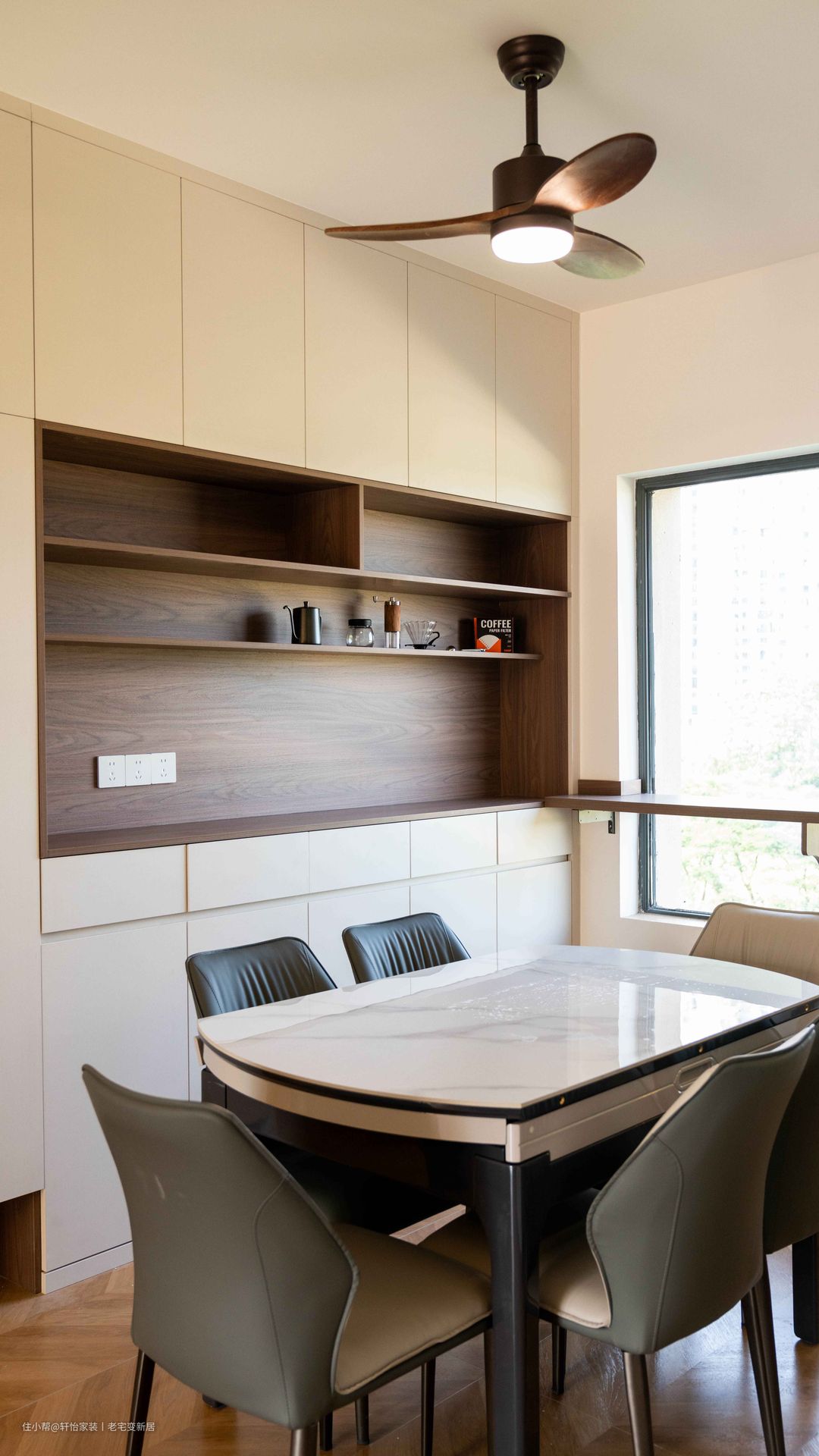餐厅以简约款桌椅为核心,复合多元使用场景,串联起三餐日常。沿窗腰部做置物台,拓展出空间的新式功用。玻璃灯饰的绿呼应了客厅,深化着搭配节奏。餐边柜的白木搭配,建立起不紧不慢、不疾不徐的秩序感,恬静而悠然。无拉手的素净,开闭有序的格局,为生活收纳更自由的尺度。