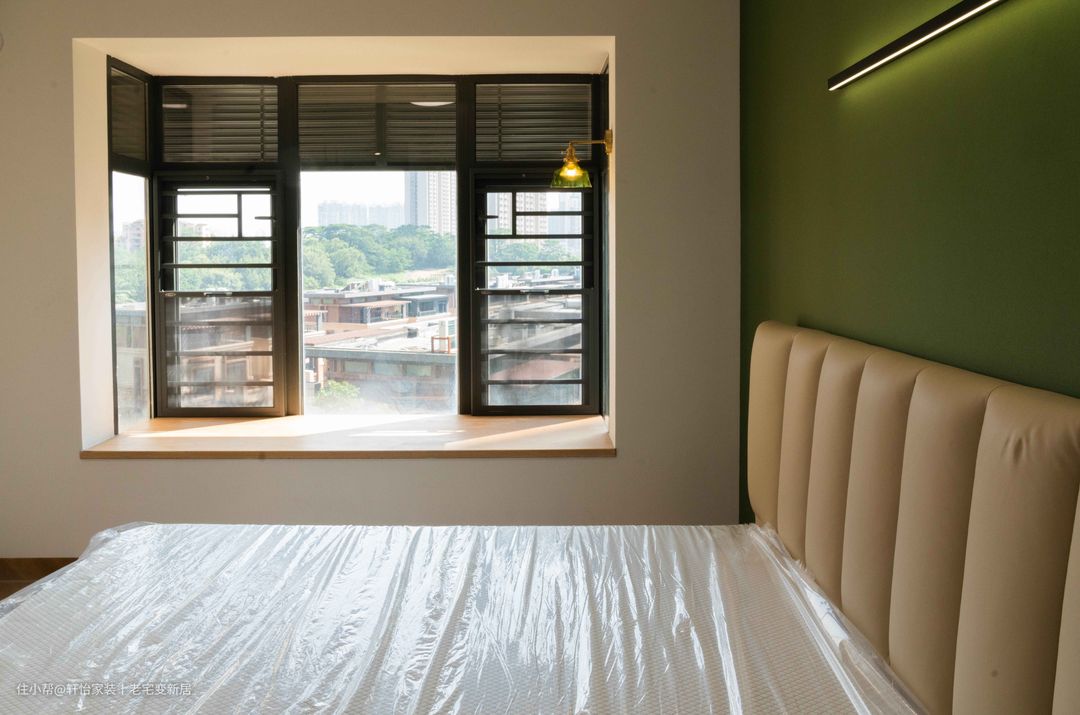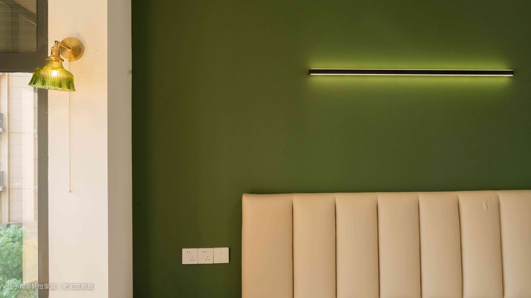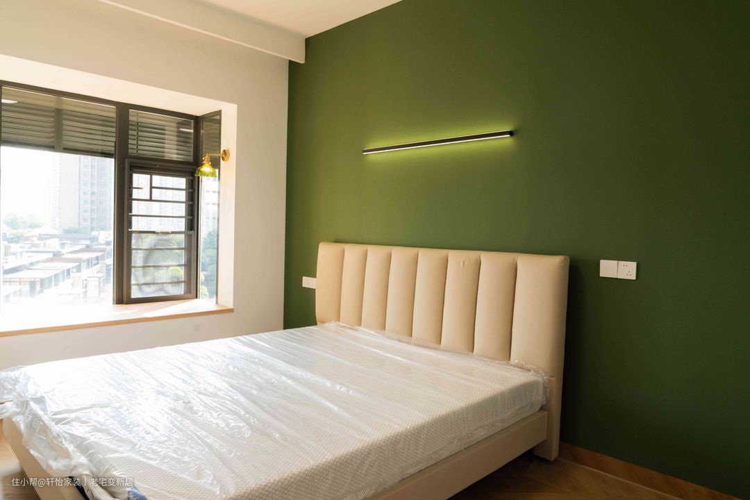次卧并未采用复杂设计,仅在元素上对整屋做呼应。简明有型,而风格永存。板状拼接的暗色床头、鱼骨拼、绿墙漆,透露出几分法式与复古。
