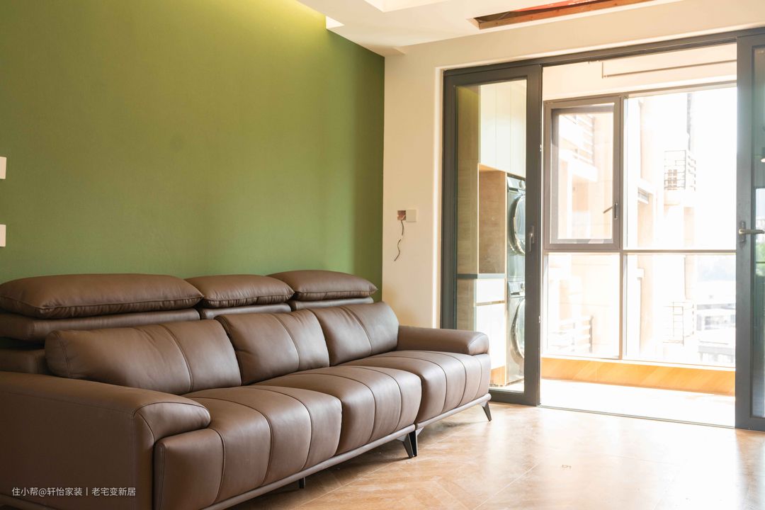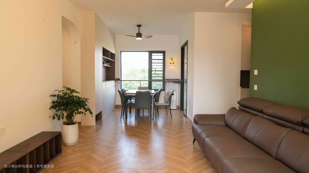 顶面有序的局部吊顶,伴随灯带以轻盈姿态跃入眼帘,传递出气质的独特。鱼骨拼花纹铺陈出空间的起承转合,开启居住者的探索序幕。巧克力色沙发线条与蓬松度交织,凸显工艺之美;迎向天花倾泻的柔光,带来几分别样意趣。而背景墙色仿佛从原有结构中渗透出,将空间带入苔藓般的潮湿感,成为古今的链接 。 抛弃传统电视柜制式,将地柜与通顶柜融合,带入灰玻新意,打破常规收纳布局,建立起新的空间秩序自带棕色氛围感的空间,呈现草木柔情般的质地,让烟火生活升起无尽诗意。