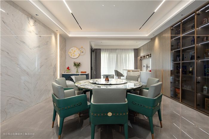 餐桌与客厅以两级台阶相连,丰富了空间的层次感。蓝色的餐椅、冷翡翠的餐桌、深灰色玻璃壁柜与造型独特的金属材质时钟、整面云母白大理石墙面相得益彰,高级感自然展现,当灯光透过摇晃的酒杯,浪漫无需刻意,美好也无需多言。