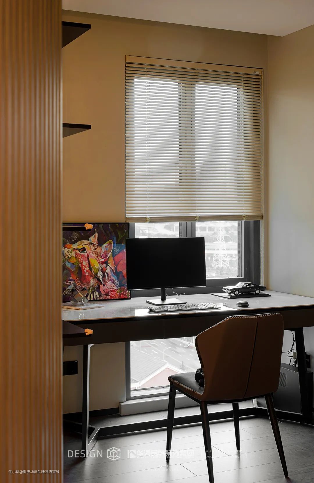这既是书房,也是猫咪活动休息的场所,在营造氛围上更注重现代的表达,靠窗摆放的书桌椅、简单且精致的猫爬架、简洁直白的物品展示架,将这件舒适的功能间变得更加地贴近业主需求