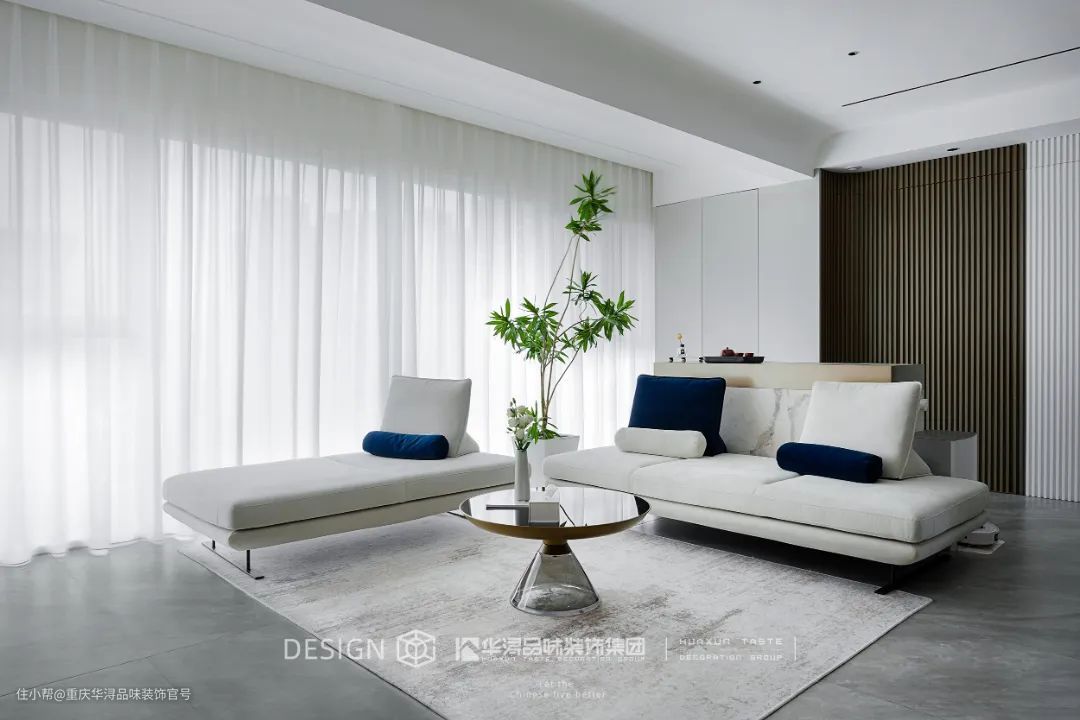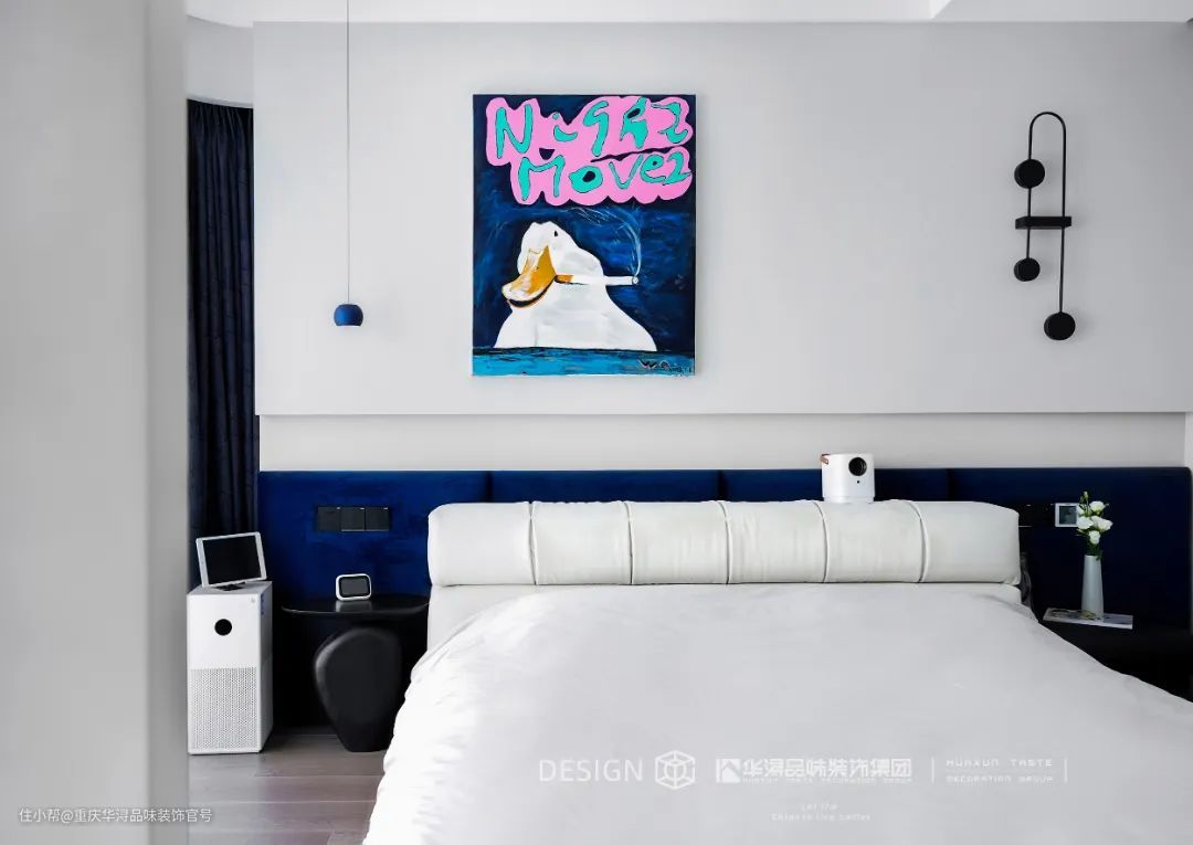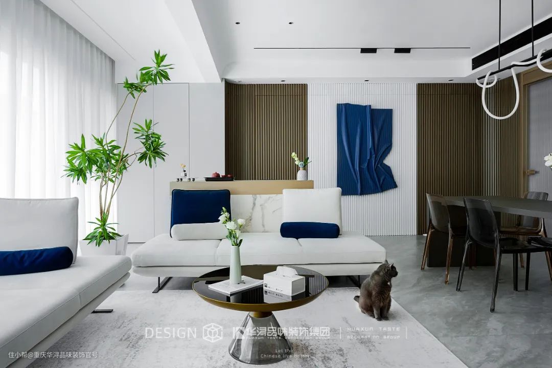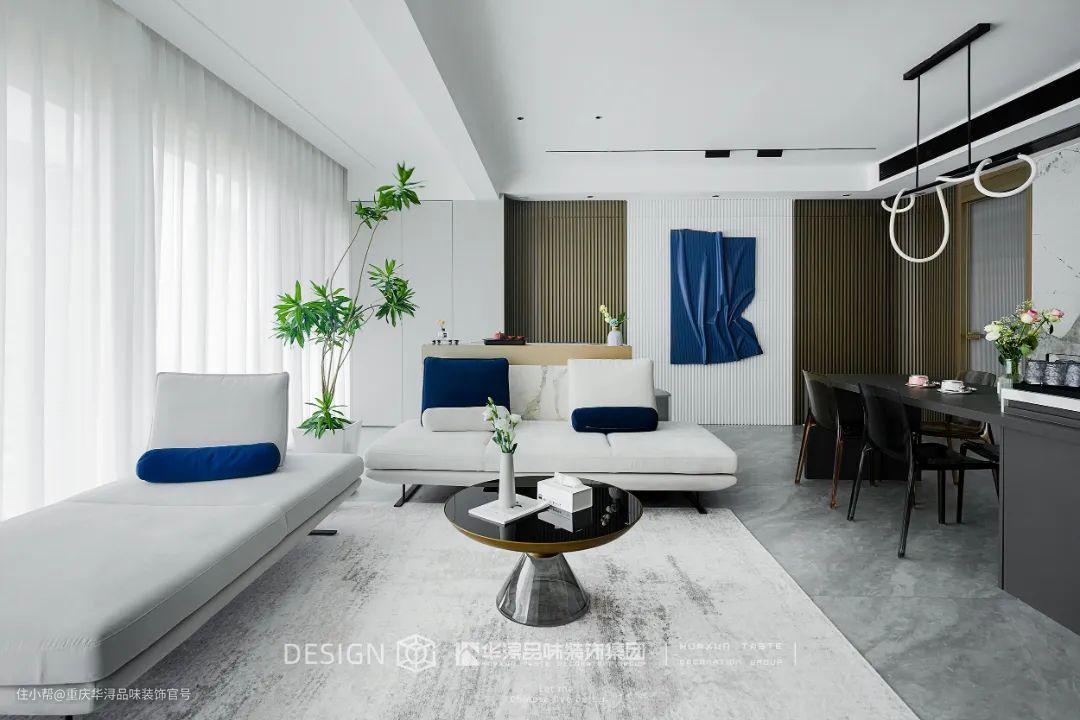 设计师将现代元素与无主灯结合,极简的家居、简洁的线条和自由的纹理,加上宽敞的空间布局带来无边界的自由感,给予浪漫惬意的视觉享受。 以白色作为极简空间的主色调,又用克莱因蓝作空间点缀,形成蓝与白的碰撞,强烈的冲击力和明净空旷的视觉效果让人迷失其中,既有现代极简的风格,又未来感十足。