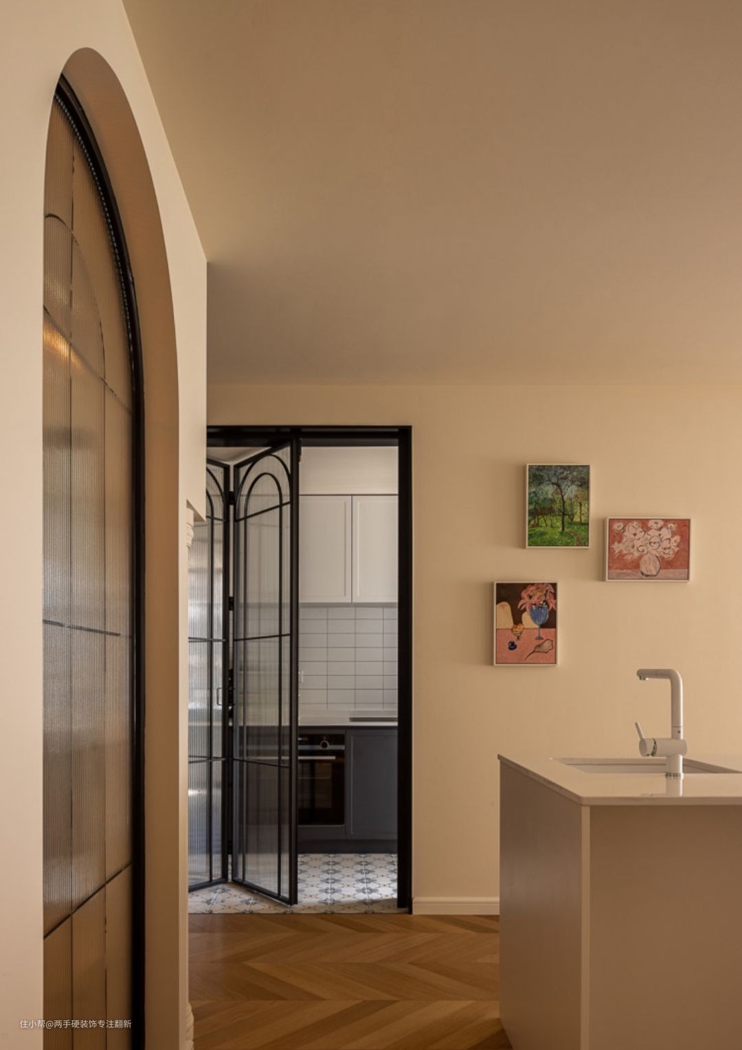 进门后,左手边是厨房,我比较喜欢开放式的设计,所以设计师就做了个推叠式造型门。平时做饭的时候可以拉上,不用的时候,就折叠到一起,完全不影响观感。