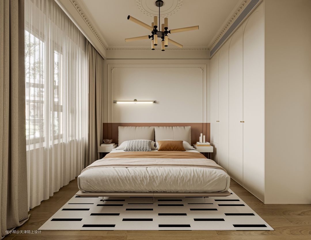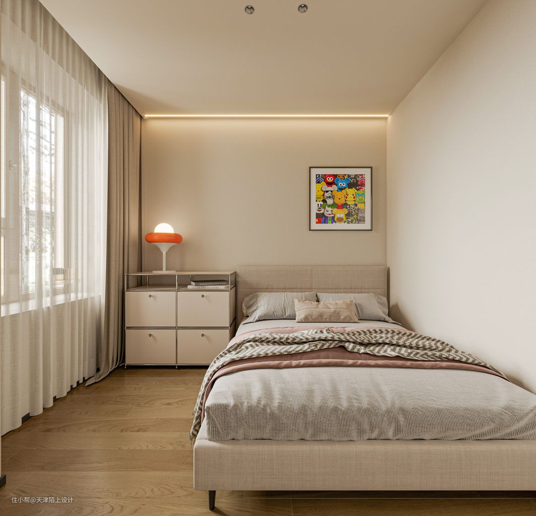 次卧的设计相对于主卧来说相对简单,没有复杂的布置。整个房间配色以奶油色和低饱和度色系为主,无主灯 的设计搭配4方格奶油色床头柜,温馨又治愈~
