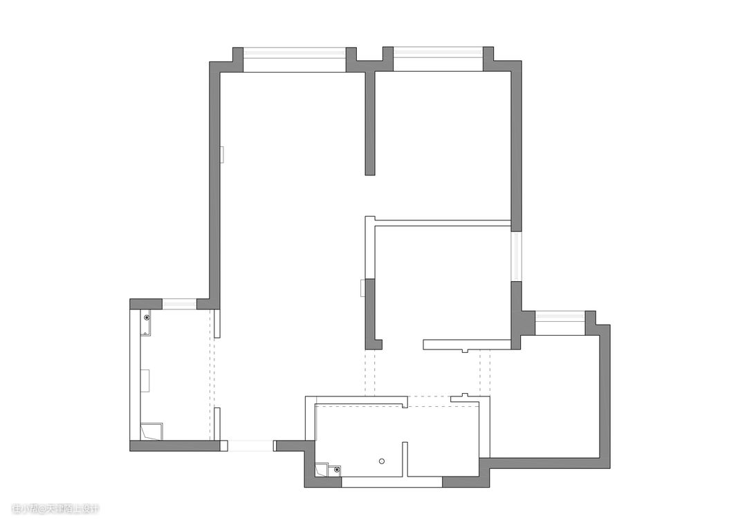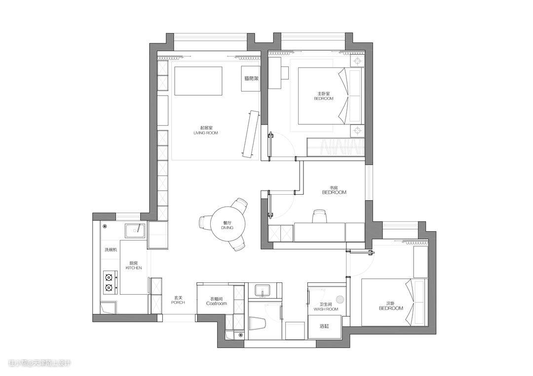 客户共有三个诉求,分别是希望有一个进门的衣帽间、卫生间实现干湿三分离和有一个完整的客厅。经过和客户沟通后,客户还是希望保留原三居室,所以设计师将主卧的门封掉,扩大整个客厅,将主卧的门和书房的门重新调整了位置和方向,在进门处,缩小卫生间的同时加入一个步入式衣帽间,通过玻璃隔断,让卫生间轻松实现干湿三分离。