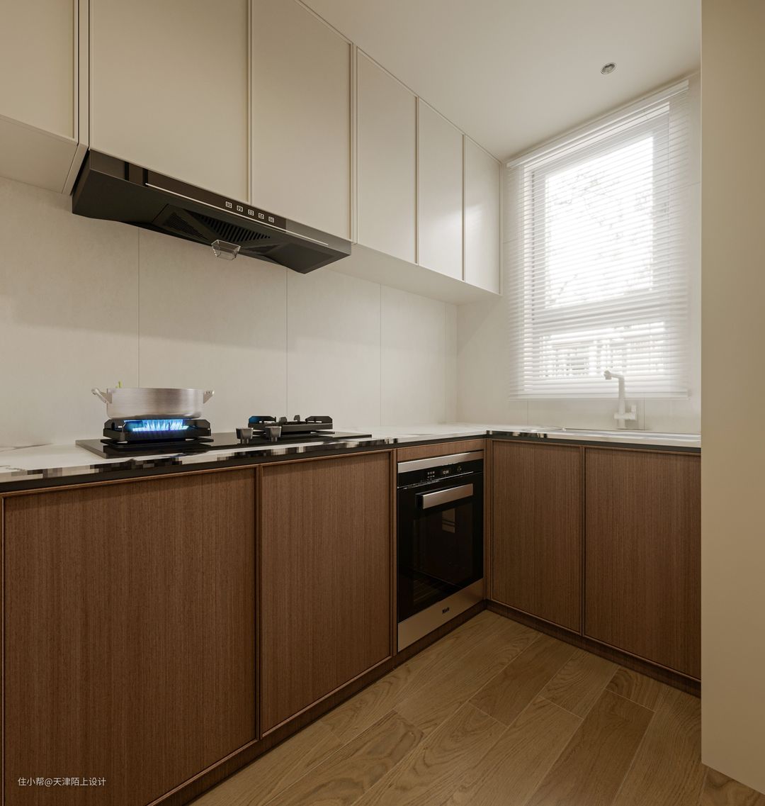 大面积的胡桃木色橱柜搭配木地板,赋予了厨房空间温润质感,在视觉上营造干净柔和的奶油风厨房色彩, 散发着既高级又自然的温馨氛围感! 在干净整洁又好看的奶油风厨房里下厨,各种坏情绪都在此刻归零了。
