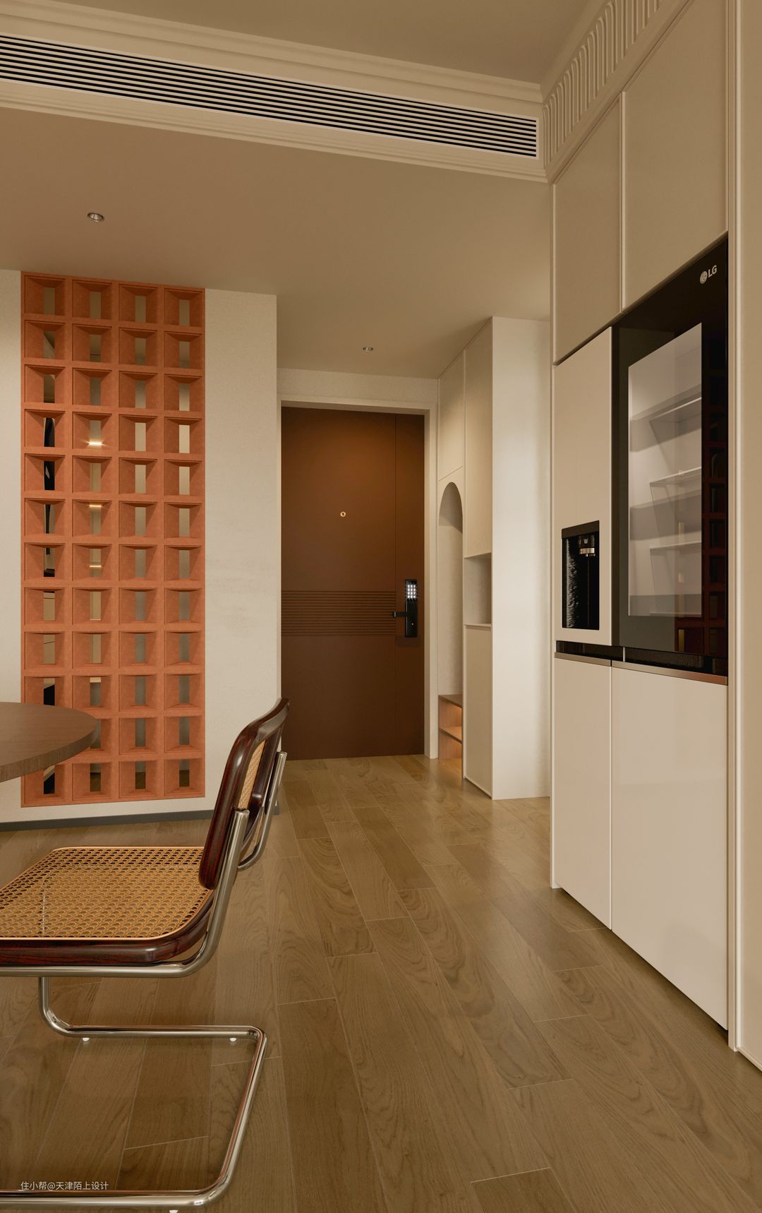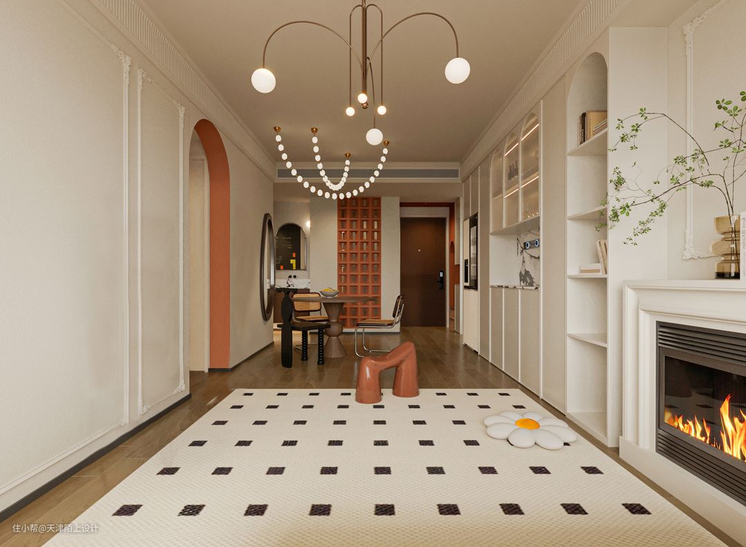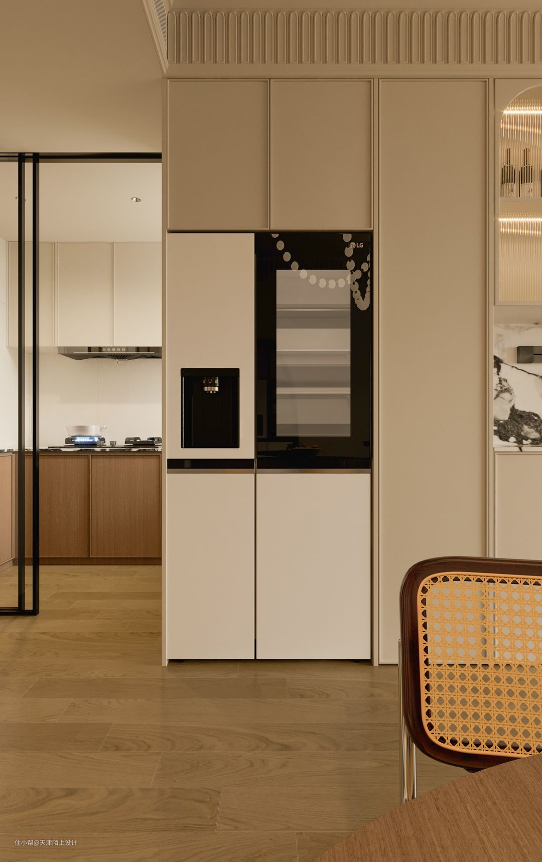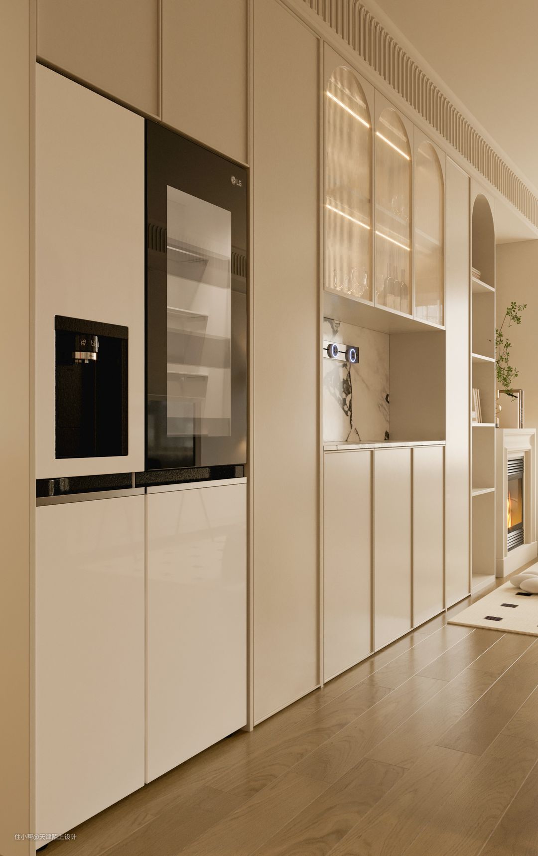 半开放式的餐厅空间,搭配圆形餐桌更有聚拢感和围合感。大理石壁炉的融入,既有很强的装饰性,又可以在寒冷的冬天带来一丝暖意。 - 顶天立地的奶油白衣柜一门做到顶,搭配透明拱形玻璃和部分开放格设计,美观的同时空间利用率也高。 - 开放式客餐厅让餐厅区域享受到优秀的采光,软装加入了一些深色元素,营造出一种“奶而不腻”的氛围感,曲线感的全身镜、色彩鲜明却不影响采光的隔断、摩登黑色的餐椅、强设计感的吊灯…… 由于业主是两位追求高品质生活的年轻人,冰箱想要容量大但要高颜值不能太笨重、最好能搭配高科技、操作简单又方便、不用多操心,在做过功课后果断选择了LG敲一敲制冰冰箱,以下这几个加分项瞬间打动了业主的心! 1. 外观高级,一秒惊艳少女心: 首先LG敲一敲制冰冰箱的颜色和外观简直绝绝子,全新莹润肤感面板,金属材质,创新添加珠光层及云母粉,打造温润流转的珠光效果,透视即亮,一秒便戳中了女业主的少女心。考虑到与整体空间的适配性和生活调性,我们最终选择的产品颜色为莹润白色。由于冰箱为嵌入式的设计,在进行全屋定制时就提前预留好了冰箱插座,由于冰箱是底部散热,所以不必担心冰箱嵌入橱柜内的散热问题。最有趣的是,冰箱冷藏室的位置有一块玻璃面板,敲一敲就能即可点亮,即使不开冰箱门,也能轻松的看到冰箱里的食品,这一"敲一敲"功能,就可以无需频繁开启冰箱门,既可以减少冷气流失,也能延长冰箱的使用寿命。 2. 抗菌保鲜,畅快享受健康生活: 俗话说,“病从口入”,吃进去的东西影响着一家人的饮食健康安全,所以冰箱的保鲜、抗菌的功能是重中之重!金属鲜冷内壁搭配门体上方自上而下的冷风风幕和内部多重冷流,形成多维风路立体循环,可以减少温差,精准控温打造无霜环境,从而保持食材的最佳口感和最优营养。Hygiene Fresh+抗菌净化系统搭配光触媒滤网4步净化,循环抗菌可以有效防止冰箱内食物串味,营造冰箱内部洁净储鲜环境。 3. 超大容量,轻松满足囤货星人的需求: 由于业主平时上班较忙,平时没有太多时间去超市,这就养成了一有时间就喜欢把冰箱塞满的囤货习惯,这款LG敲一敲制冰冰箱的635L超大容量,业主再也不用担心冰箱储存不够用了,而且它合理的分区空间管理,可以实现食材分区储存,极大满足了业主的生活需求,这种想装多少就装多少的快乐,轻松满足了囤货星人的需求。 4. 业主强推功能!智能制冰系统,随取随用,无需等待! LG敲一敲制冰冰箱拥有着嵌入式设计的制冰机储冰室,智能的制冰系统,可以畅享冰块、碎冰、冰水三种冰品,UV Nano™ 紫外线杀菌系统让直饮冰水更安全,无论是深夜小酌来杯加入碎冰的啤酒、朋友小聚时加入冰块鸡尾酒的片刻享受,还是酣畅淋漓之后的一杯冰水,都能做到制冰快捷,随取随用,让业主无需等待。