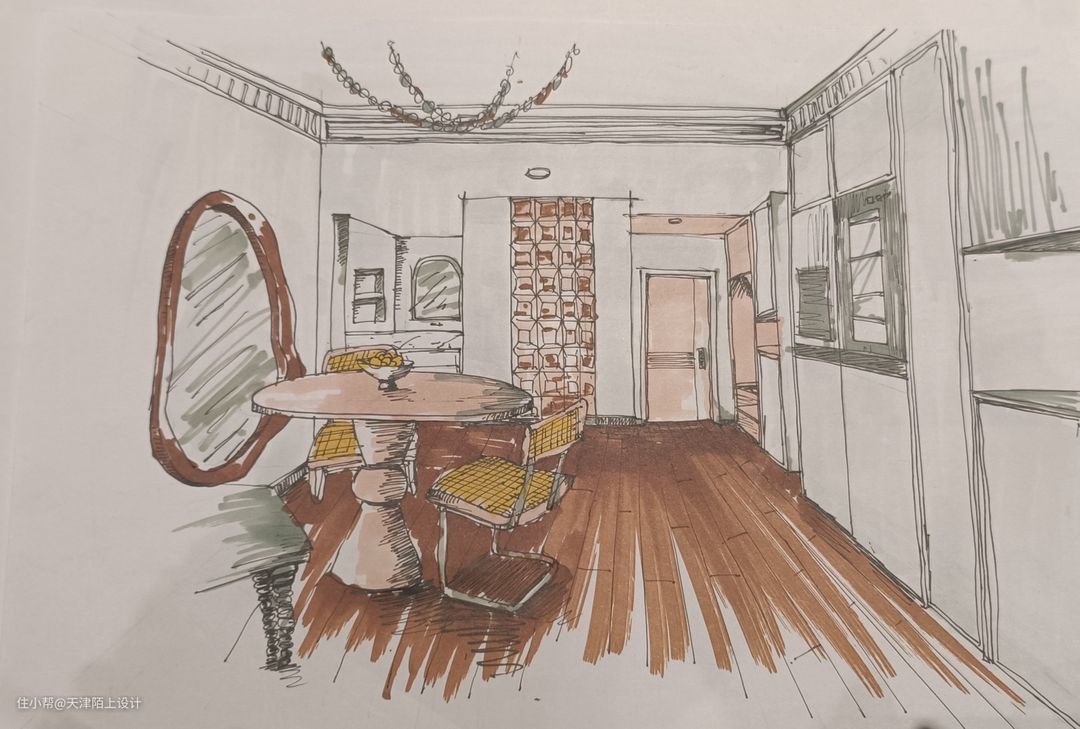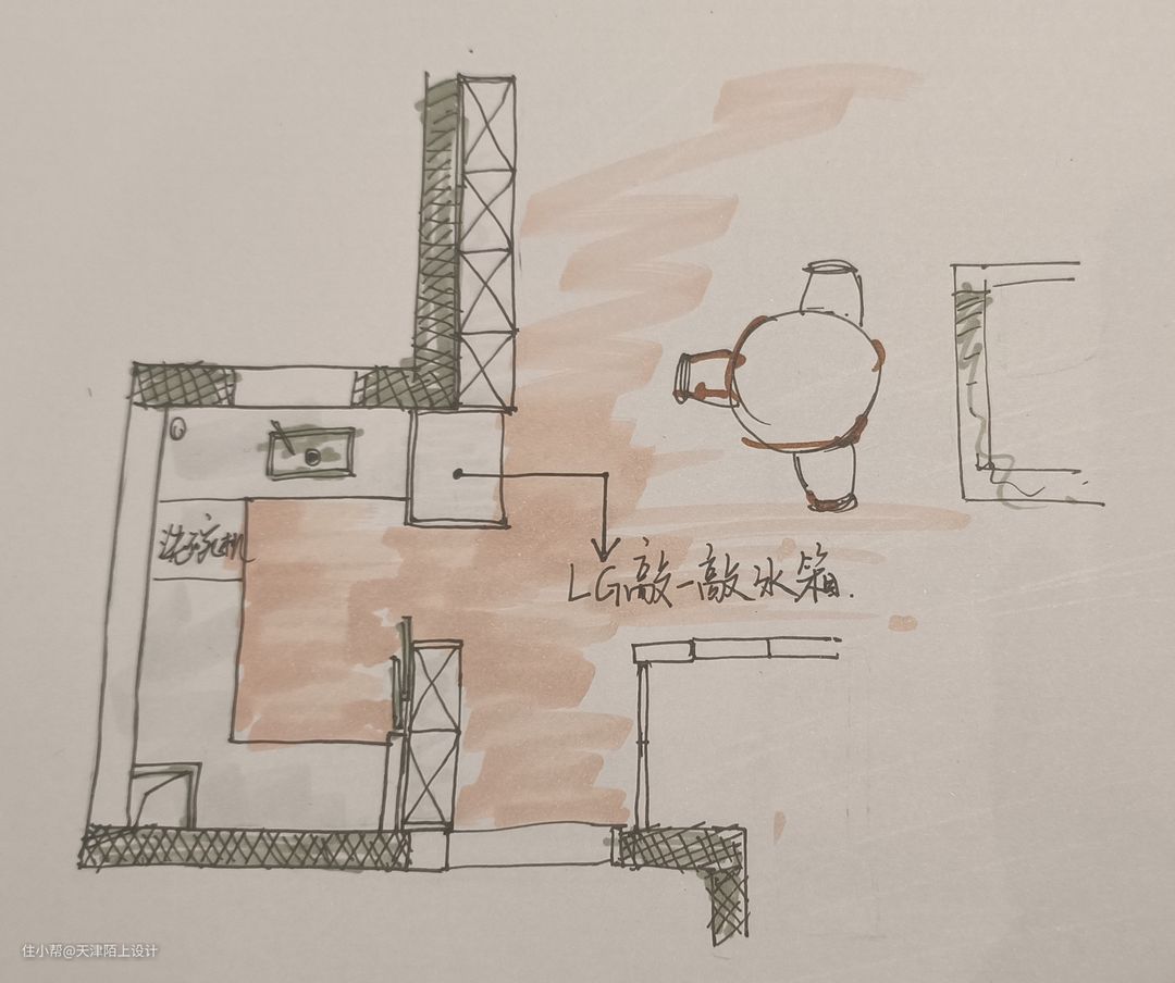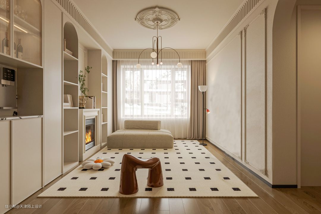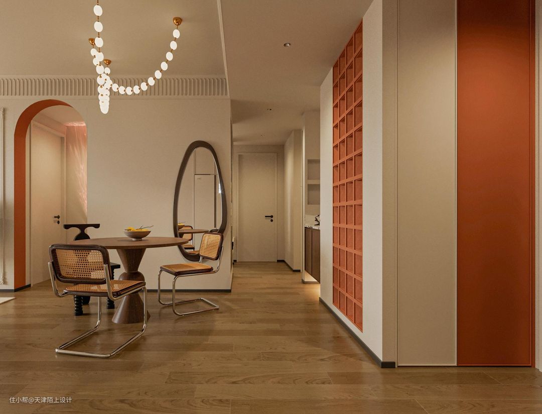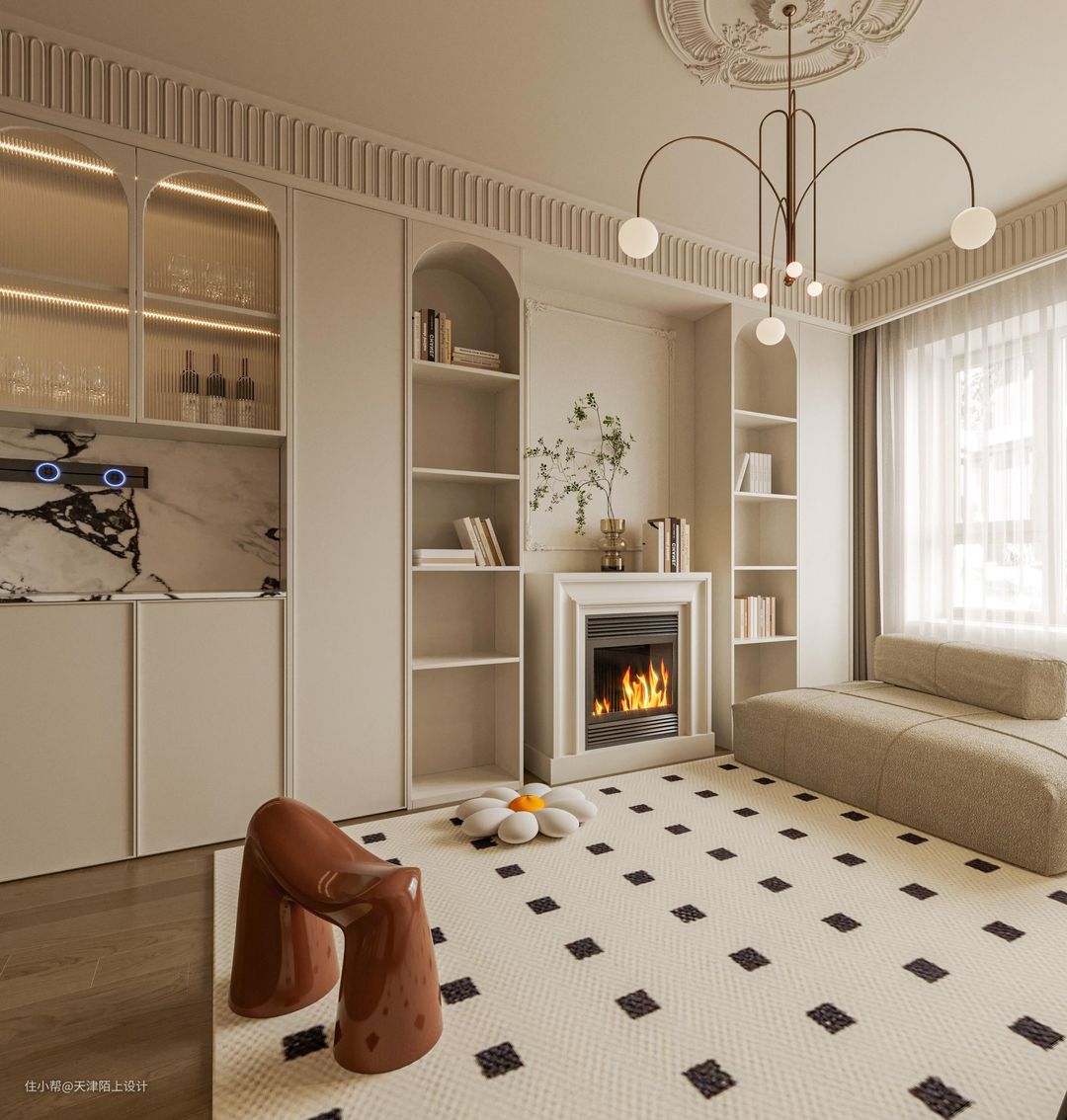 半开放式的餐厅空间,搭配圆形餐桌更有聚拢感和围合感。大理石壁炉的融入,既有很强的装饰性,又可以在寒冷的冬天带来一丝暖意。 - 顶天立地的奶油白衣柜一门做到顶,搭配透明拱形玻璃和部分开放格设计,美观的同时空间利用率也高。 - 开放式客餐厅让餐厅区域享受到优秀的采光,软装加入了一些深色元素,营造出一种“奶而不腻”的氛围感,曲线感的全身镜、色彩鲜明却不影响采光的隔断、摩登黑色的餐椅、强设计感的吊灯…… 由于业主是两位追求高品质生活的年轻人,冰箱想要容量大但要高颜值不能太笨重、最好能搭配高科技、操作简单又方便、不用多操心,在做过功课后果断选择了LG敲一敲制冰冰箱,以下这几个加分项瞬间打动了业主的心! 1. 外观高级,一秒惊艳少女心: 首先LG敲一敲制冰冰箱的颜色和外观简直绝绝子,全新莹润肤感面板,金属材质,创新添加珠光层及云母粉,打造温润流转的珠光效果,透视即亮,一秒便戳中了女业主的少女心。考虑到与整体空间的适配性和生活调性,我们最终选择的产品颜色为莹润白色。由于冰箱为嵌入式的设计,在进行全屋定制时就提前预留好了冰箱插座,由于冰箱是底部散热,所以不必担心冰箱嵌入橱柜内的散热问题。最有趣的是,冰箱冷藏室的位置有一块玻璃面板,敲一敲就能即可点亮,即使不开冰箱门,也能轻松的看到冰箱里的食品,这一"敲一敲"功能,就可以无需频繁开启冰箱门,既可以减少冷气流失,也能延长冰箱的使用寿命。 2. 抗菌保鲜,畅快享受健康生活: 俗话说,“病从口入”,吃进去的东西影响着一家人的饮食健康安全,所以冰箱的保鲜、抗菌的功能是重中之重!金属鲜冷内壁搭配门体上方自上而下的冷风风幕和内部多重冷流,形成多维风路立体循环,可以减少温差,精准控温打造无霜环境,从而保持食材的最佳口感和最优营养。Hygiene Fresh+抗菌净化系统搭配光触媒滤网4步净化,循环抗菌可以有效防止冰箱内食物串味,营造冰箱内部洁净储鲜环境。 3. 超大容量,轻松满足囤货星人的需求: 由于业主平时上班较忙,平时没有太多时间去超市,这就养成了一有时间就喜欢把冰箱塞满的囤货习惯,这款LG敲一敲制冰冰箱的635L超大容量,业主再也不用担心冰箱储存不够用了,而且它合理的分区空间管理,可以实现食材分区储存,极大满足了业主的生活需求,这种想装多少就装多少的快乐,轻松满足了囤货星人的需求。 4. 业主强推功能!智能制冰系统,随取随用,无需等待! LG敲一敲制冰冰箱拥有着嵌入式设计的制冰机储冰室,智能的制冰系统,可以畅享冰块、碎冰、冰水三种冰品,UV Nano™ 紫外线杀菌系统让直饮冰水更安全,无论是深夜小酌来杯加入碎冰的啤酒、朋友小聚时加入冰块鸡尾酒的片刻享受,还是酣畅淋漓之后的一杯冰水,都能做到制冰快捷,随取随用,让业主无需等待。