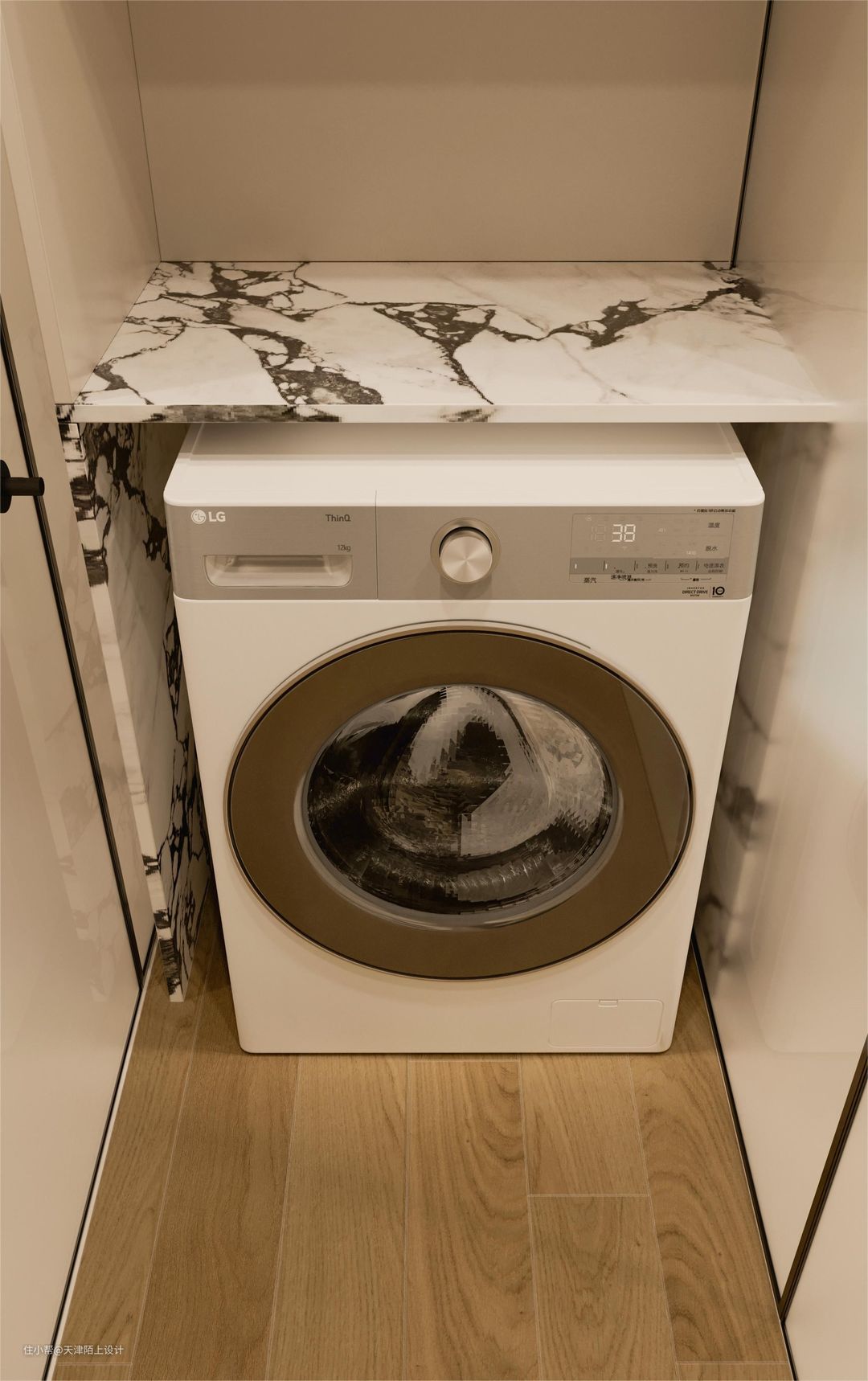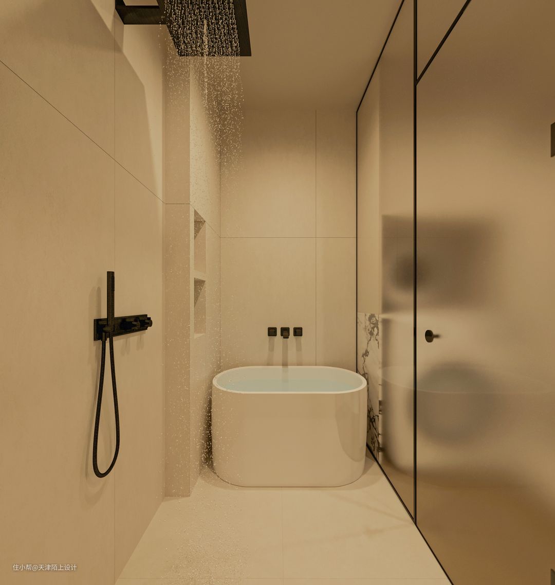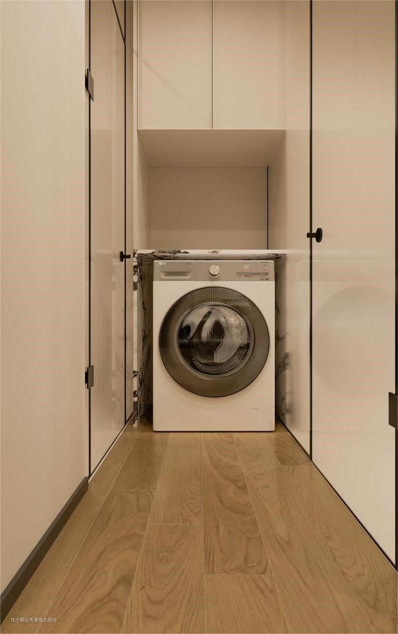 由于业主想要浴室,洗手池,衣帽间干湿三分离,我们便整体缩小了浴室卫生间的面积,扩大出来一个步入式衣帽间。中间挡板区域兼具收纳空间,可熨烫、叠放衣服,拿取方便同时节省空间还顺手。洗衣机则是嵌入下方墙柜里,空间整齐又不占空间。 在前期沟通时我们得知,女业主有轻度的洁癖,男业主对螨虫过敏,所以女业主对洗衣机的选择十分的严格,这款产品它希望带有高品质洗烘一体的套装功能。经过我们的推荐,最终女业主选择了这款LG小旋风Max12kg洗衣机,这里就不得不提一提这款洗衣机是如何打动这位“挑剔”的女业主了。 1. 外观高级,超大容量,360°速净喷淋+39分钟速净洗: 首先LG小旋风Max12kg洗衣机的外观是采用的是钢钻玻璃门板材质,搭配白色机身,与整体空间风格非常协调统一;其次,它的12kg规格的洗衣机大筒可以同时清洗多件衣服,内置凸起的全不锈钢提升器,可以避免衣服缠绕在一起。里面有4个喷水口,可以实现360°速净喷淋同时加速洗涤剂溶解洗、漂、甩全程只需39分钟就可以了! 2. LG自主研发的第五代人工智能DD电机+双转子双变频热泵烘干机轻松实现洗烘一体: 它搭载的LG自主研发的人工智能DD电机+双转子双变频热泵烘干机,可以实现AI智慧洗,洗衣机可以自己检测衣物的重量面料软硬,洗衣时还能感知桶里的衣服分布,实时的调整洗衣角度和强度,减少噪音的同时也能将洗涤剂均匀地喷洒在衣物上,能减少18%的衣物损伤,还可以选择6种智能手洗组合洗涤模式清洗,分别是洁净敲(去除顽渍)、蓬松解(防止缠绕)、穿透挤(漂洗洁净)、浸透揉(瓦解污渍)、强劲搓(洁净升级)、舒缓摇(呵护衣物),可以根据自己的需求自由选择,这个功能方便又实用,即使是有轻微洁癖的女业主,也能做到让客户”心服口服”! 3. 蒸汽防过敏除螨,除螨菌率高达99.99%。 由于男业主对螨虫过敏,所以业主在洗衣时也非常注重除菌杀螨的烘干功能,这款LG小旋风Max12kg洗衣机经中国家电检测所防过敏(尘螨)项目检测证明,LG全自动滚筒洗衣机蒸汽功能可有效祛除尘螨等过敏原,有了权威认证,男业主再也不用担心螨虫过敏会浑身痒的问题啦! 值得一提的是,LG的品牌完全值得信赖,售后方面也完全不用担心,现在购买的话还会赠送电机10年包修服务!!现在入手,LG小旋风Max12kg洗衣机绝对是一个不容错过的选择! - 由于浴室的空间比较小,为了避免杂乱没有选用带纹理的瓷砖,墙地一体通铺的是柔光微水泥奶油黄的瓷砖,搭配同色系美缝,效果更整洁舒适。使空间看起来明亮宽敞,高级又柔和!悬浮马桶的使用,减少了卫生死角,日常打理起来很容易。 悬挂式花洒淋浴配备小型浴缸,淋浴泡澡两不误。这个浴室面积不大,一踏进却能让人卸下一身的疲惫,满满的的幸福感。 倘若家庭被赋予为心灵的庇护所,那么我更愿意称其为一个因为拥有彼此牵挂的另一半而使内心更为安定的场所。 如同本案的业主在挑选产品时的每一个“精细”的小习惯,皆源于对另一半的尊重与呵护,因此期望阅读到本期案例的诸位,也能够同样体验到那份将对方深藏于心的情感。 #双12家电如何选购