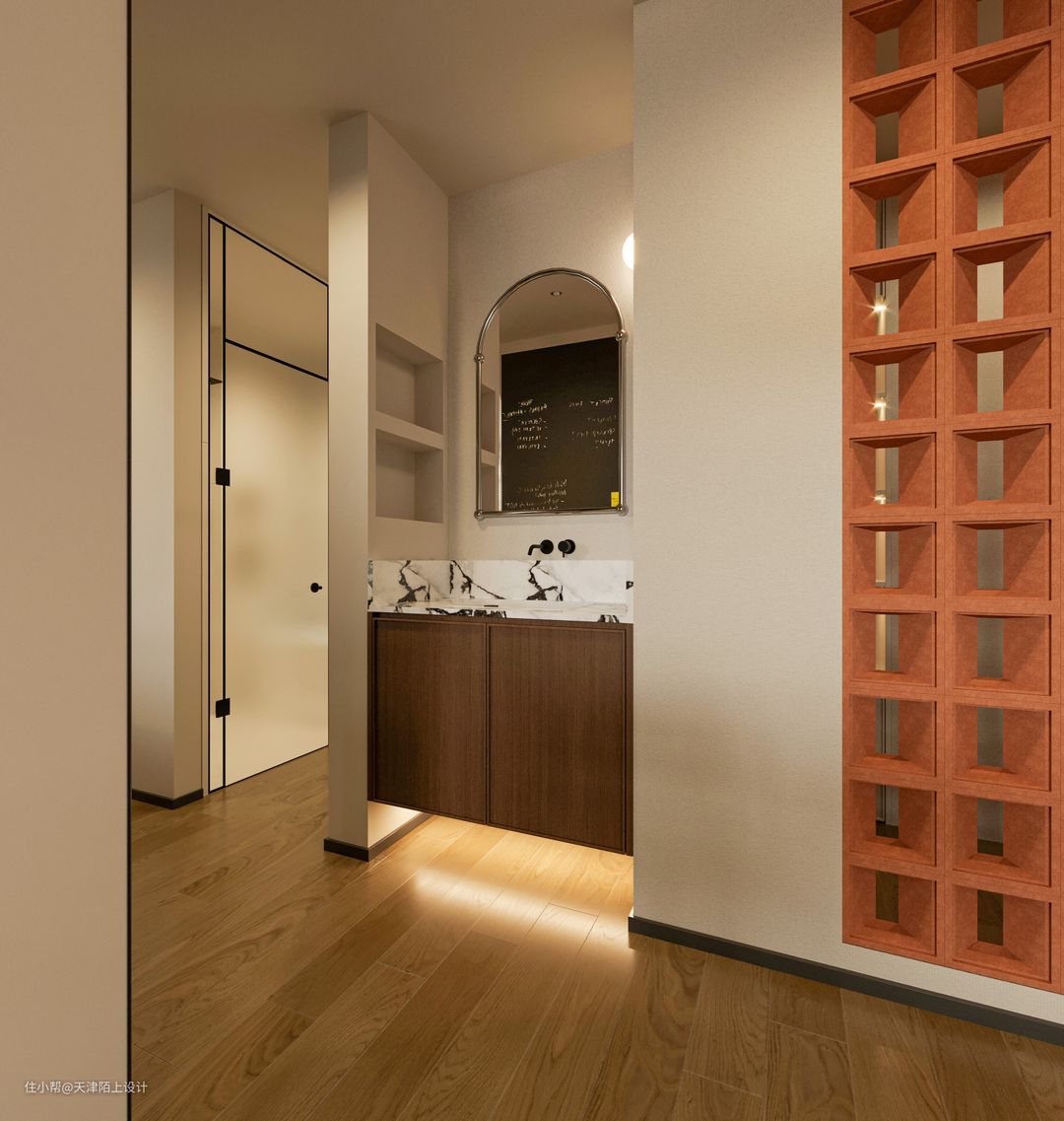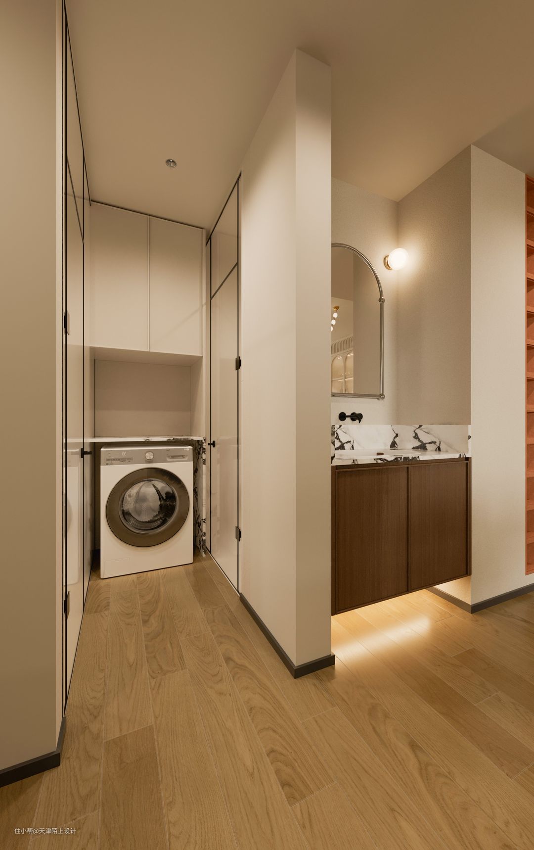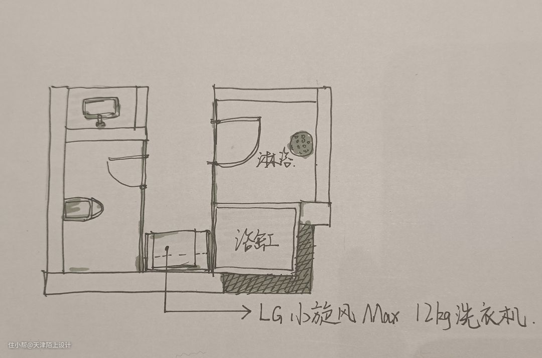 由于业主想要浴室,洗手池,衣帽间干湿三分离,我们便整体缩小了浴室卫生间的面积,扩大出来一个步入式衣帽间。中间挡板区域兼具收纳空间,可熨烫、叠放衣服,拿取方便同时节省空间还顺手。洗衣机则是嵌入下方墙柜里,空间整齐又不占空间。 在前期沟通时我们得知,女业主有轻度的洁癖,男业主对螨虫过敏,所以女业主对洗衣机的选择十分的严格,这款产品它希望带有高品质洗烘一体的套装功能。经过我们的推荐,最终女业主选择了这款LG小旋风Max12kg洗衣机,这里就不得不提一提这款洗衣机是如何打动这位“挑剔”的女业主了。 1. 外观高级,超大容量,360°速净喷淋+39分钟速净洗: 首先LG小旋风Max12kg洗衣机的外观是采用的是钢钻玻璃门板材质,搭配白色机身,与整体空间风格非常协调统一;其次,它的12kg规格的洗衣机大筒可以同时清洗多件衣服,内置凸起的全不锈钢提升器,可以避免衣服缠绕在一起。里面有4个喷水口,可以实现360°速净喷淋同时加速洗涤剂溶解洗、漂、甩全程只需39分钟就可以了! 2. LG自主研发的第五代人工智能DD电机+双转子双变频热泵烘干机轻松实现洗烘一体: 它搭载的LG自主研发的人工智能DD电机+双转子双变频热泵烘干机,可以实现AI智慧洗,洗衣机可以自己检测衣物的重量面料软硬,洗衣时还能感知桶里的衣服分布,实时的调整洗衣角度和强度,减少噪音的同时也能将洗涤剂均匀地喷洒在衣物上,能减少18%的衣物损伤,还可以选择6种智能手洗组合洗涤模式清洗,分别是洁净敲(去除顽渍)、蓬松解(防止缠绕)、穿透挤(漂洗洁净)、浸透揉(瓦解污渍)、强劲搓(洁净升级)、舒缓摇(呵护衣物),可以根据自己的需求自由选择,这个功能方便又实用,即使是有轻微洁癖的女业主,也能做到让客户”心服口服”! 3. 蒸汽防过敏除螨,除螨菌率高达99.99%。 由于男业主对螨虫过敏,所以业主在洗衣时也非常注重除菌杀螨的烘干功能,这款LG小旋风Max12kg洗衣机经中国家电检测所防过敏(尘螨)项目检测证明,LG全自动滚筒洗衣机蒸汽功能可有效祛除尘螨等过敏原,有了权威认证,男业主再也不用担心螨虫过敏会浑身痒的问题啦! 值得一提的是,LG的品牌完全值得信赖,售后方面也完全不用担心,现在购买的话还会赠送电机10年包修服务!!现在入手,LG小旋风Max12kg洗衣机绝对是一个不容错过的选择! - 由于浴室的空间比较小,为了避免杂乱没有选用带纹理的瓷砖,墙地一体通铺的是柔光微水泥奶油黄的瓷砖,搭配同色系美缝,效果更整洁舒适。使空间看起来明亮宽敞,高级又柔和!悬浮马桶的使用,减少了卫生死角,日常打理起来很容易。 悬挂式花洒淋浴配备小型浴缸,淋浴泡澡两不误。这个浴室面积不大,一踏进却能让人卸下一身的疲惫,满满的的幸福感。 倘若家庭被赋予为心灵的庇护所,那么我更愿意称其为一个因为拥有彼此牵挂的另一半而使内心更为安定的场所。 如同本案的业主在挑选产品时的每一个“精细”的小习惯,皆源于对另一半的尊重与呵护,因此期望阅读到本期案例的诸位,也能够同样体验到那份将对方深藏于心的情感。 #双12家电如何选购