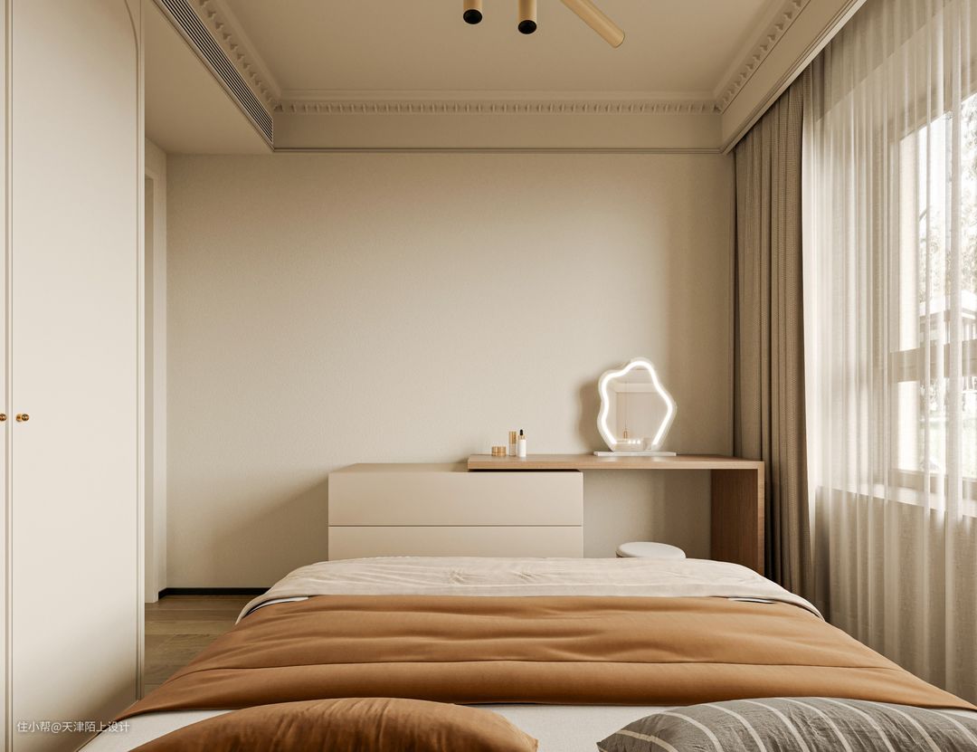卧室是最好的休息空间,可以让人卸下一身的疲惫彻底放松身心,所以对于设计风格并没有进行复杂的布置。卧室墙面地板色调统一协调,全部选用适合奶油风的浅色调木地板,床头背景墙选择低饱和度色墙板,同时与屋顶都加入法式石膏花线元素更有设计感。拐角处的衣柜做一门到顶简约又耐看。床的另一侧放有成品家具收缩式化妆桌,柜体简约轻盈~而且更加实用。