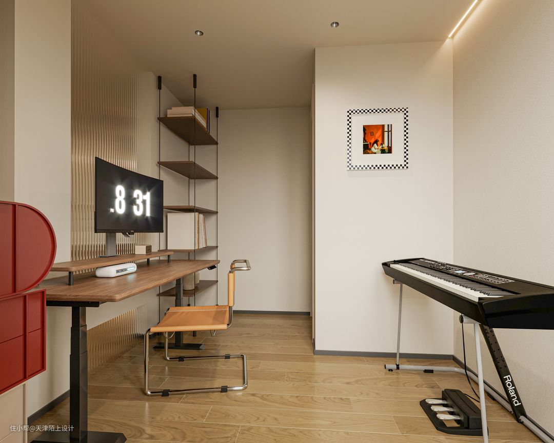 房的设计比较简单,结合业主的使用需求,调整后的书房被改造成形成琴房一体的办公休闲区域。常用的独立书房比不常用的客卧更实用,书房和钢琴房结合在一起之后,在学习或者工作劳累之后还可以弹弹钢琴,看看书,搭配无吊灯射灯简直氛围感十足!