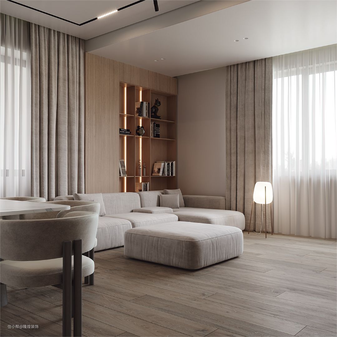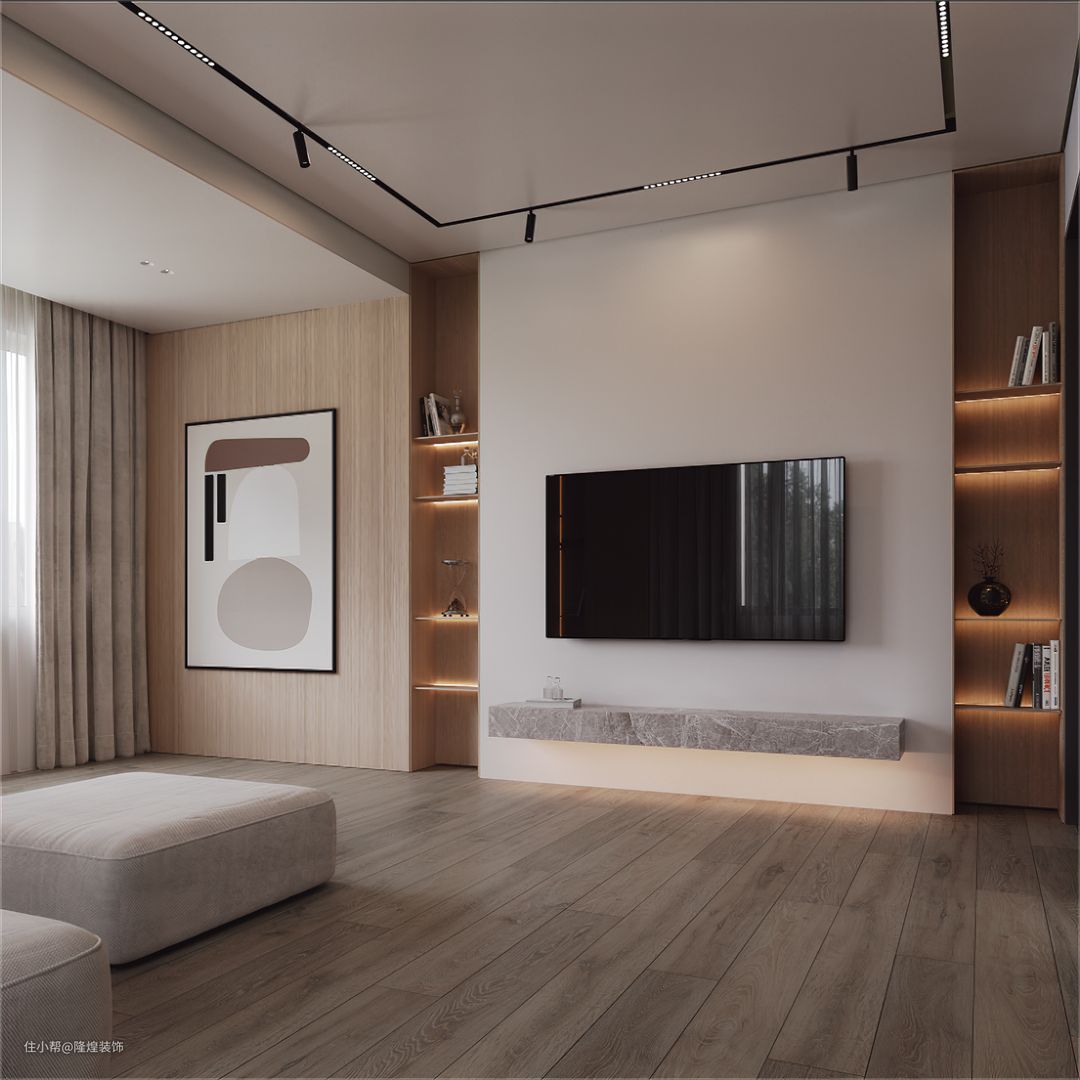 客厅从地板到置物柜都是原木设计,追求环保、低调、简约、自由的装修语言。电视墙两边做内嵌置物架设计,加上隐秘灯带更有氛围感。沙发不光材质舒适,视觉上也很柔软。