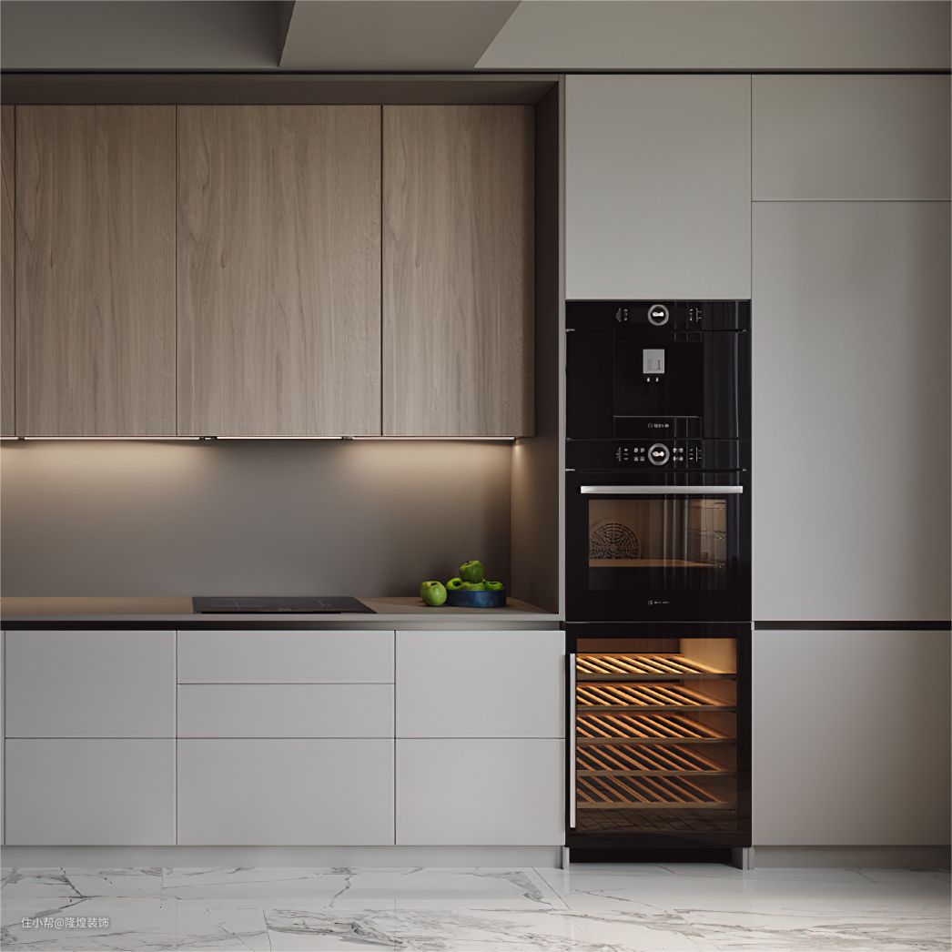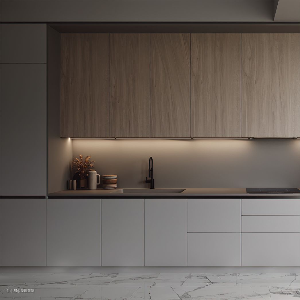厨房空间不大,一体式橱柜增加收纳的同时视觉上整洁美观。中间设计隐秘灯带照亮每一个死角。