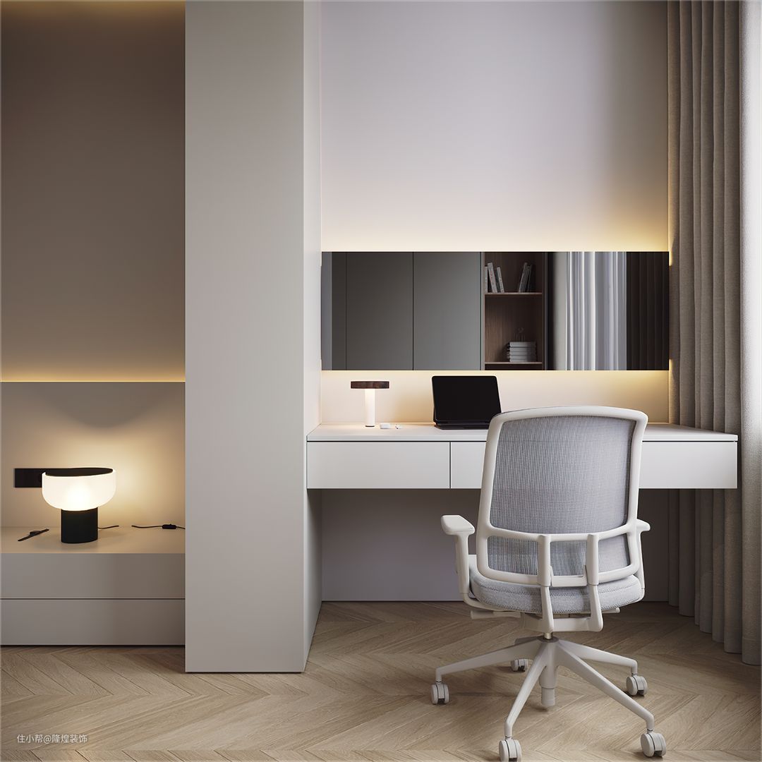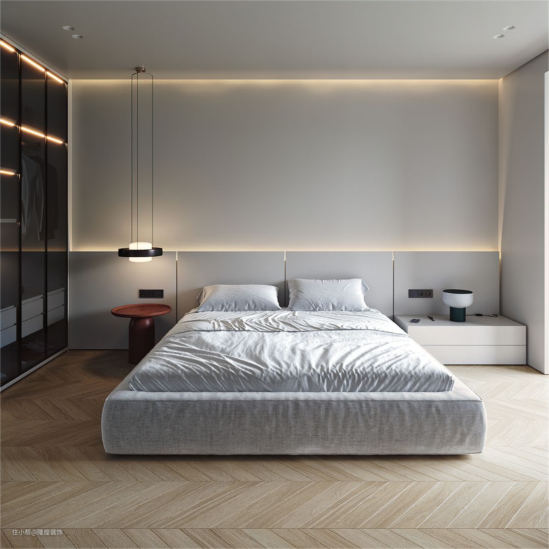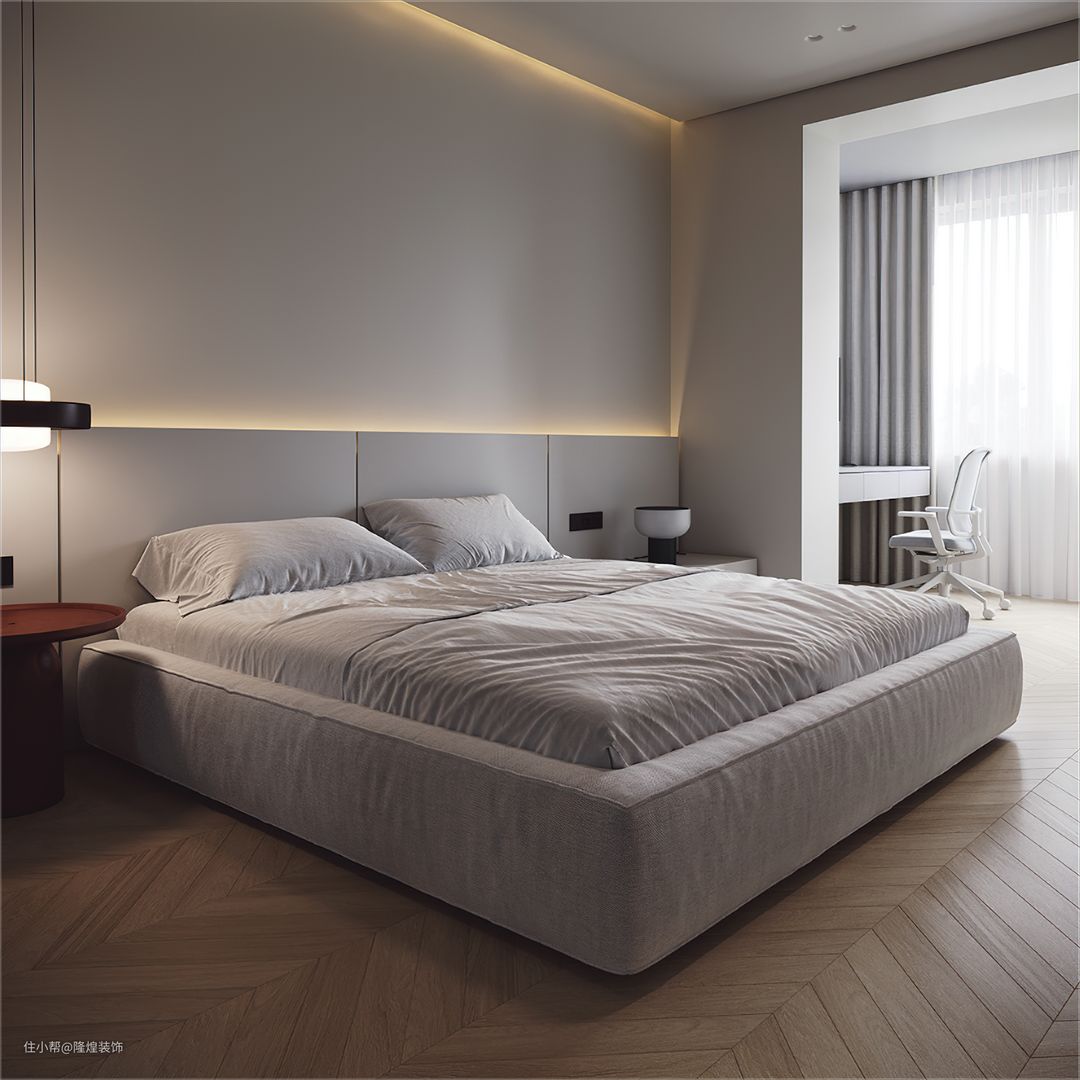 卧室没有设计主灯,隐秘灯带+床头灯+孔灯足够保证空间亮度。飘窗打掉做落地窗设计光线更好。