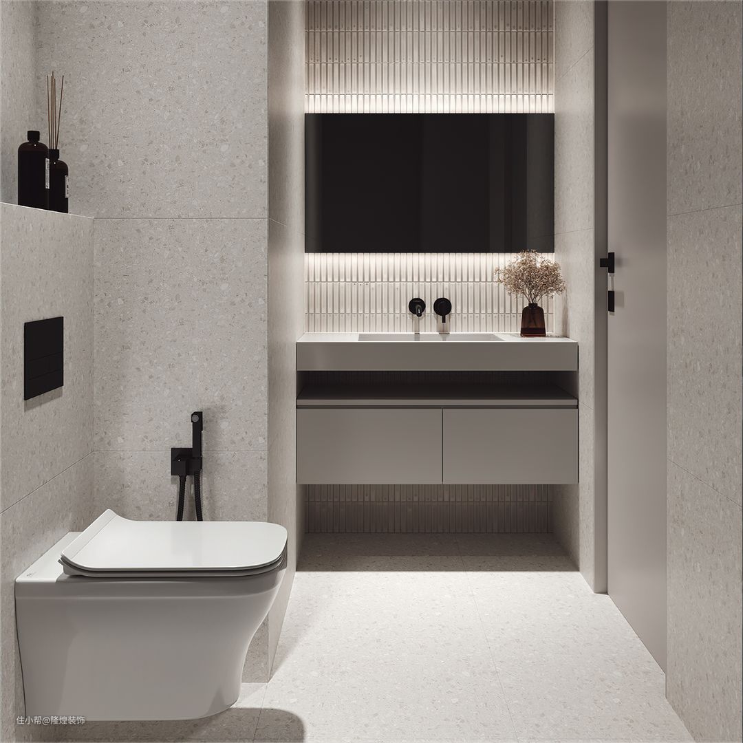 马桶上方留出置物台,放上香薰除味不错的选择,整体米白配色更显干净舒适。