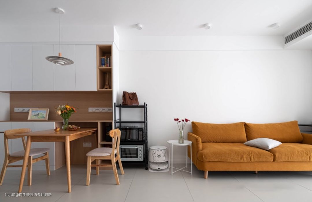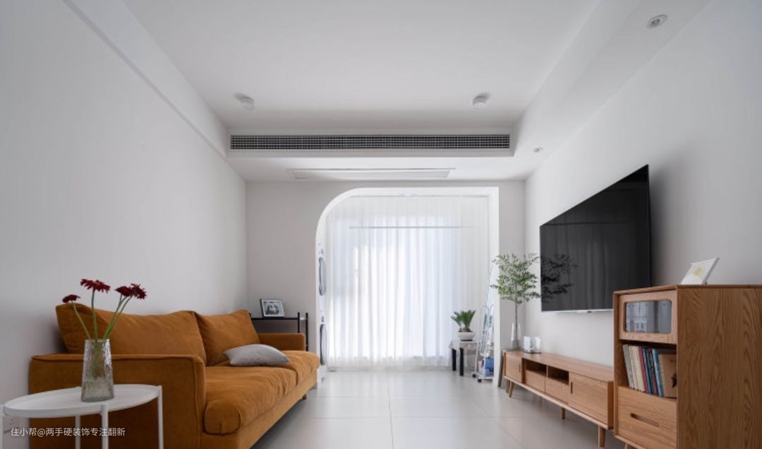▲客厅无主灯设计,尽量避免大面积吊顶,多个明装筒灯作为主灯照明来使用。四周吊顶以挂边形式延伸,避免吊顶出现”断层“的不美感。