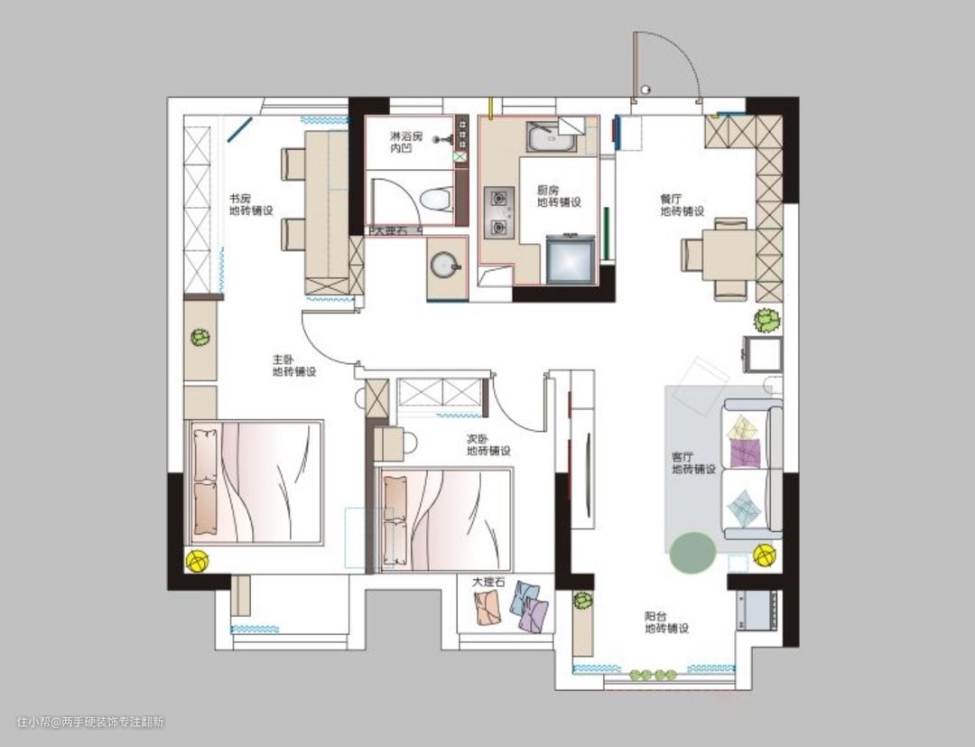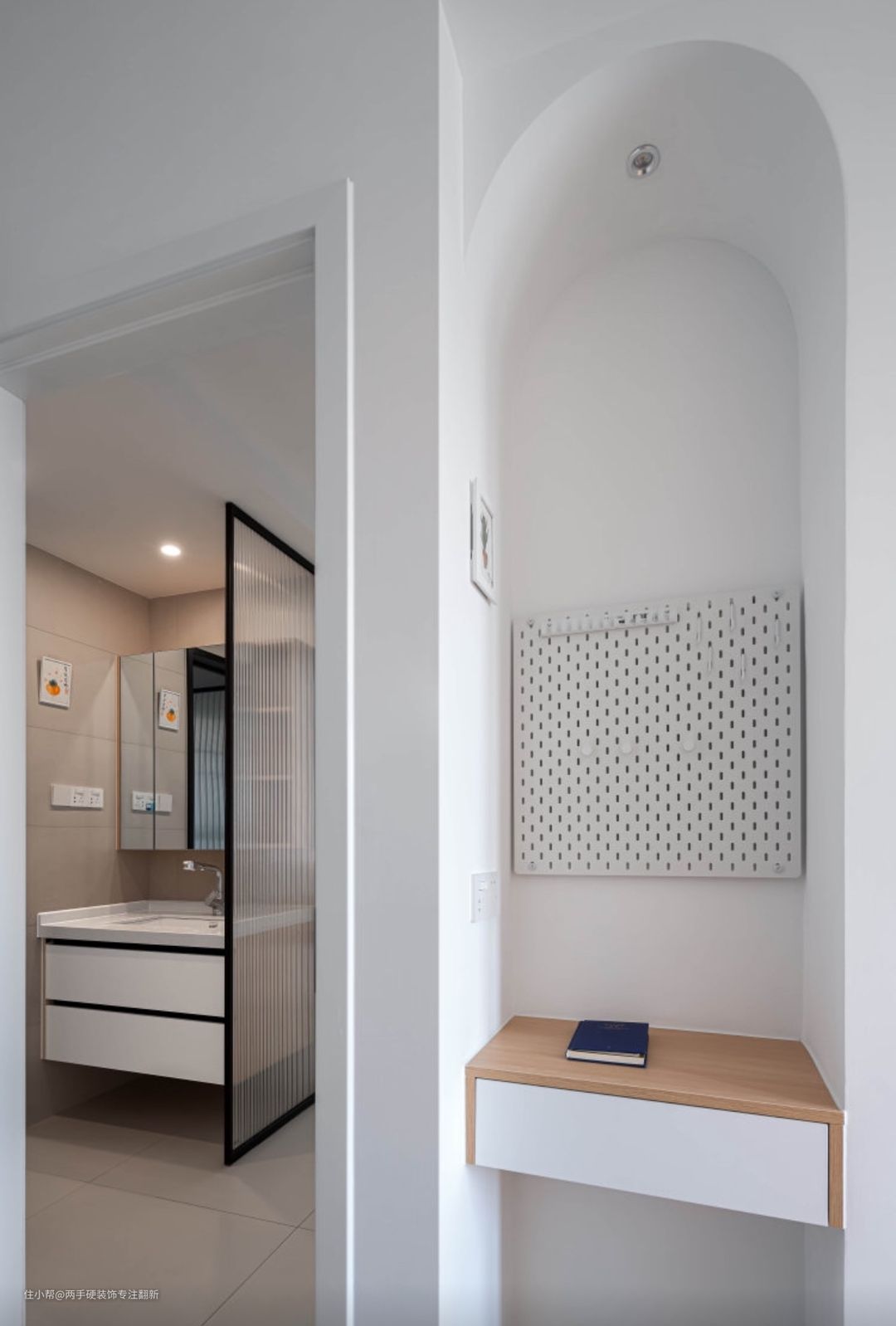 结合屋主需求,我们对原户型作了如下优化: 1、将主卧与次卧的墙体推倒,重新优化主卧与次卧的分隔比例,并且利用墙体的”蛇形走位“相互借位放下各自需要的书桌/梳妆台。 2、卫生间土建局部下沉的结构,屋主有需求使用挂壁式马桶,淋浴房内利用包管省出了一个壁龛,可以不用买成品的置物架啦。 3、客厅阳台通透、将玻璃移门移除。