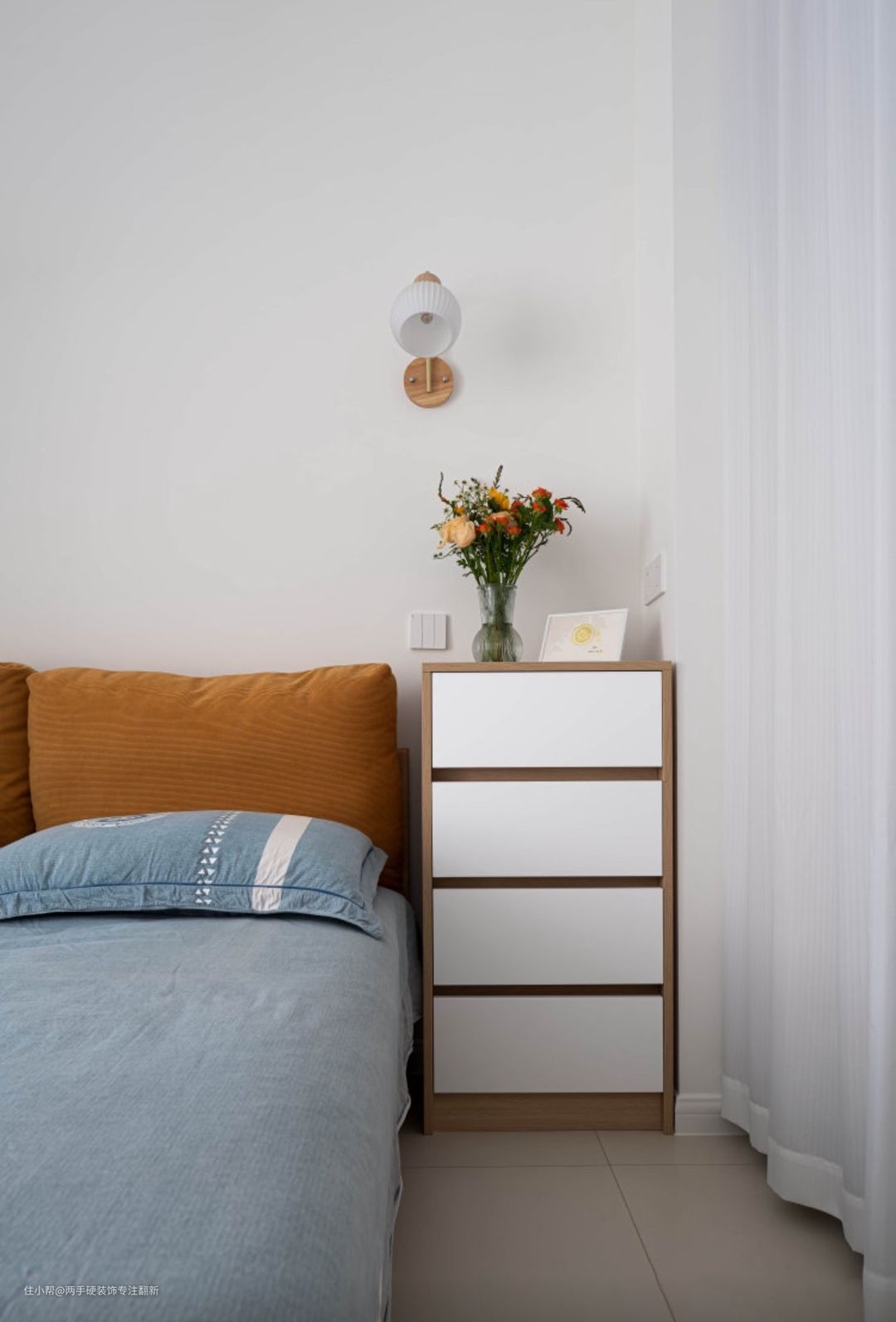 卧直接将斗柜代替床头柜功能,储衣区同样采用成品架子来代替衣柜功能。力求少使用板材以减少甲醛的产生。