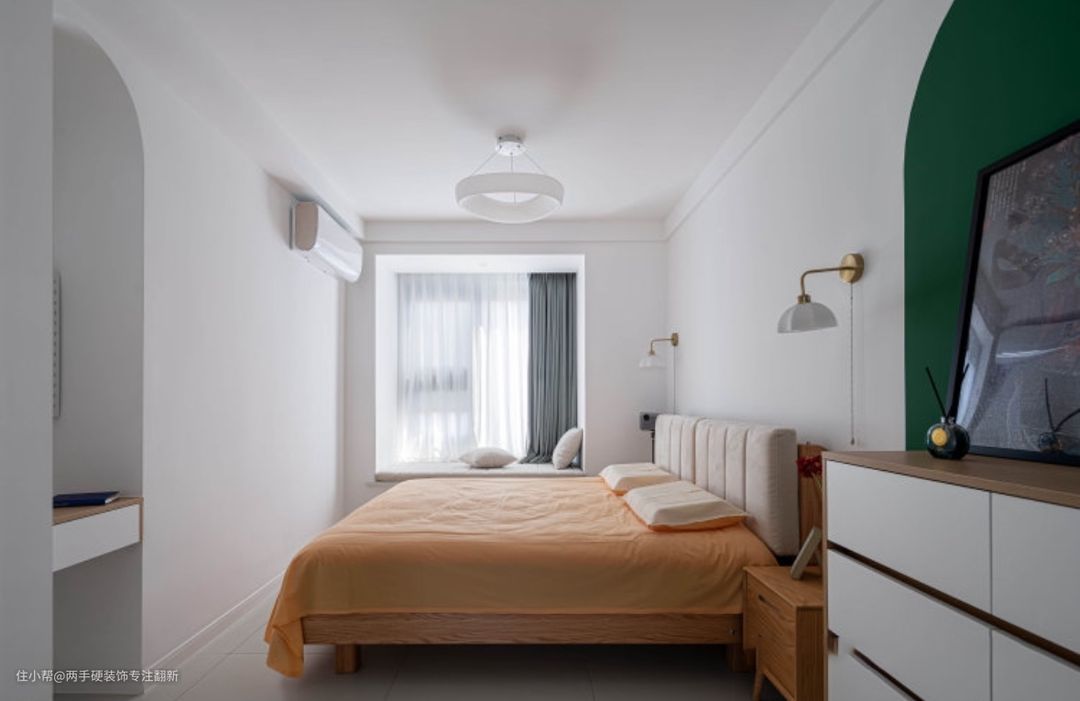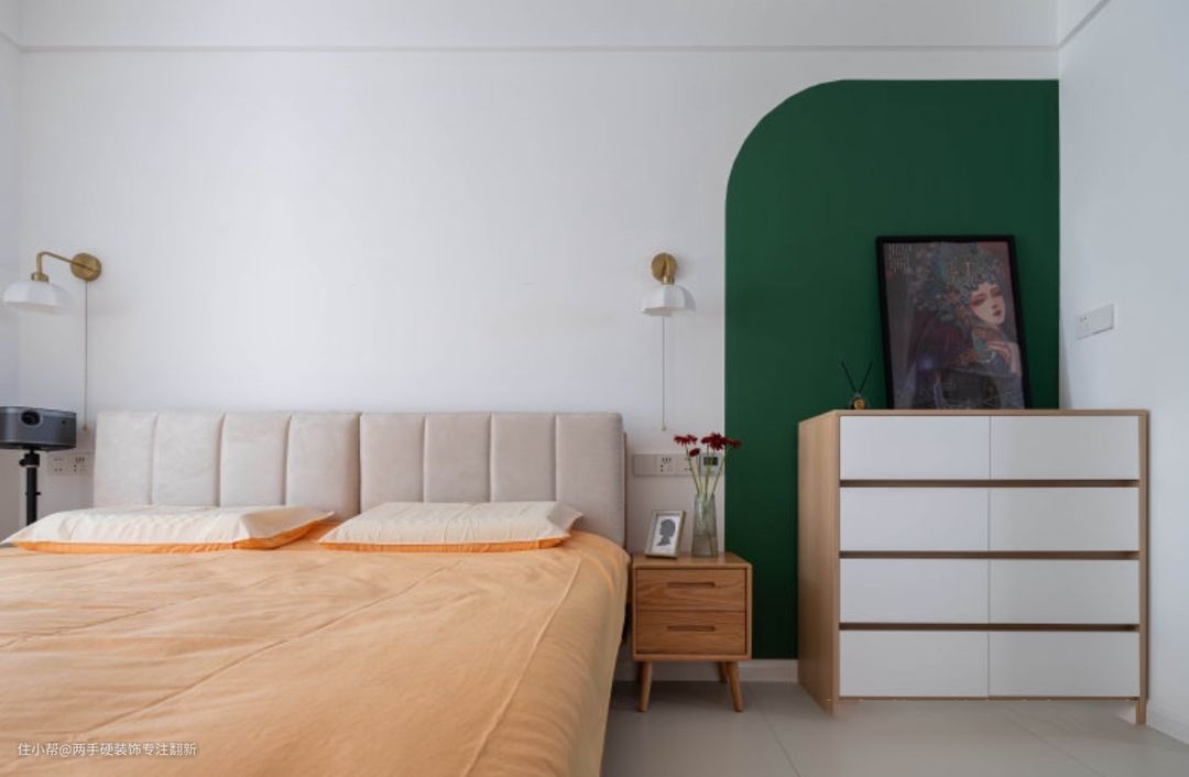 ▲主卧重新划分,床体尽量靠窗户一侧,主要以便携式投影仪作为娱乐设施。床头主要以涂料色块造型,点缀。