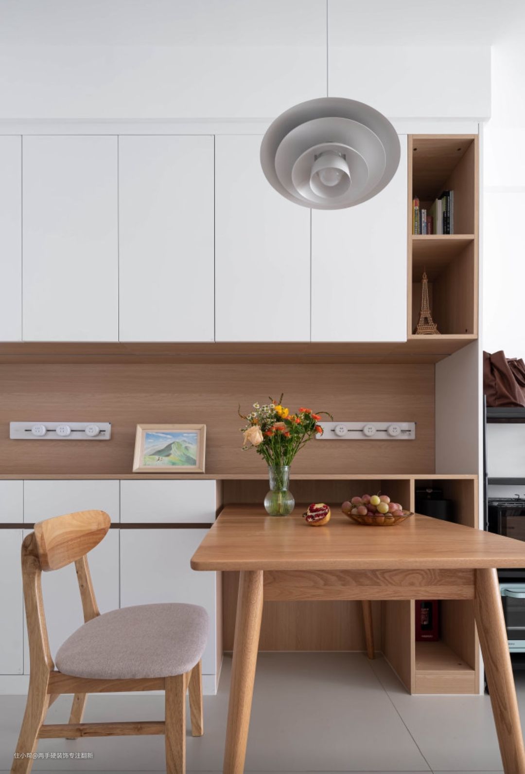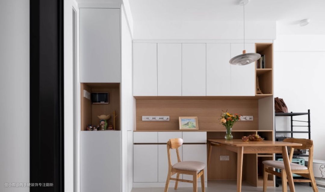 餐厅餐桌部分,提前规划了餐桌的宽度,柜体部分留空,家里人少时可以将餐桌部分长度”藏“到柜体内。人多时,可以将餐桌手动搬出来。