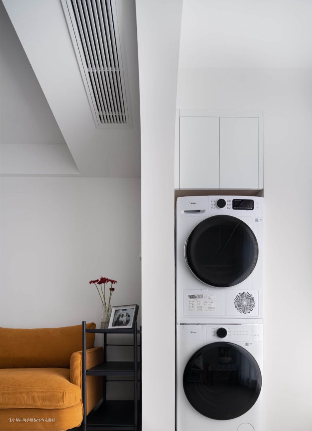 干衣+洗衣套装堆叠在一起,土建结构的尺寸刚刚好,连贴砖的可能都没有给。堆叠后的上方也不能放过,规划了吊柜。可以作为储备柜使用,频繁拿取的物品不宜放在上面。