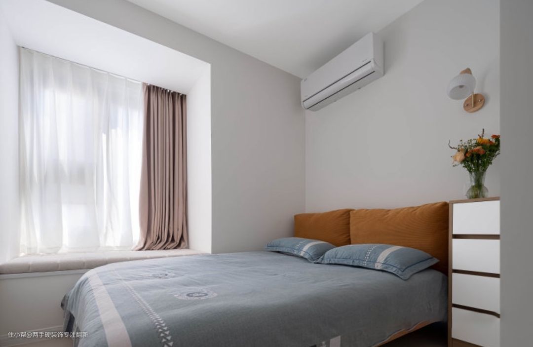 主卧使用普通的挂壁空调,所以几乎没有吊顶。因为有重新划分主卧与次卧空间,导致顶面有梁体漏出,只是为了吊顶延展性,四周都做了挂边处理。