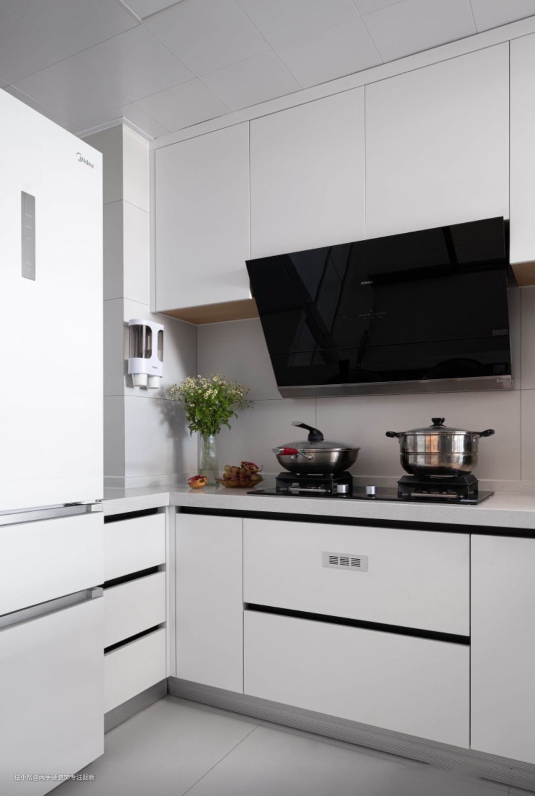 厨房整体空间没有做改造,U型的橱柜布置,留出了冰箱位置。