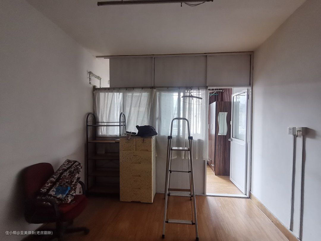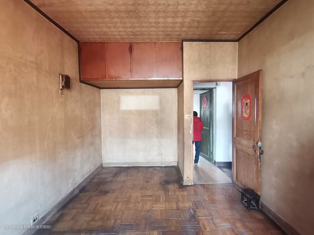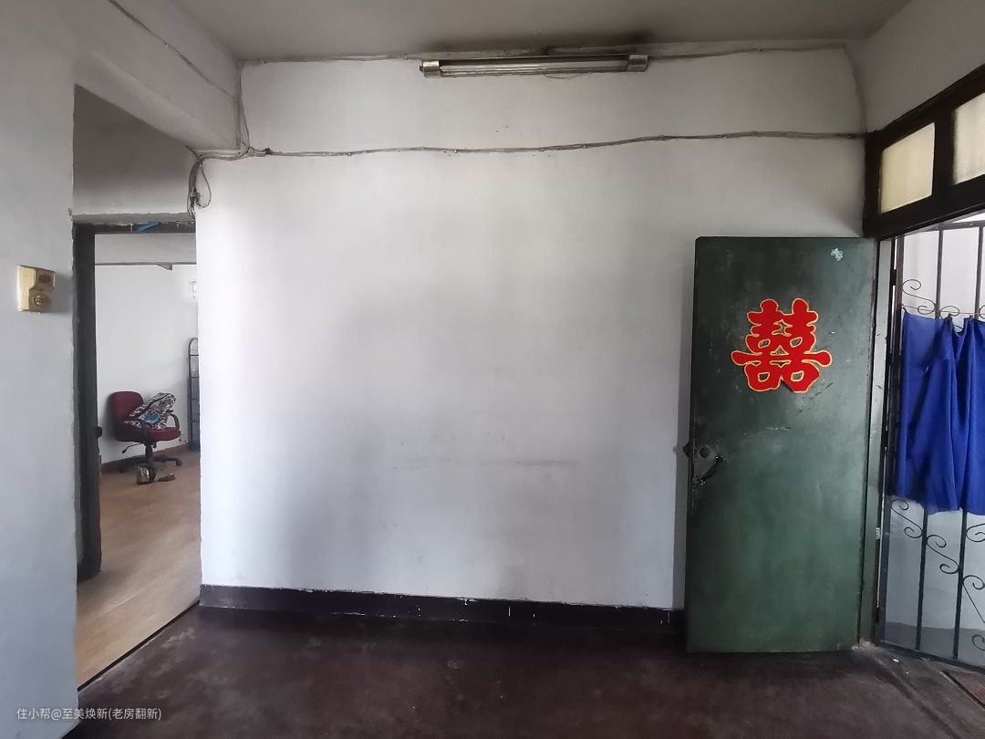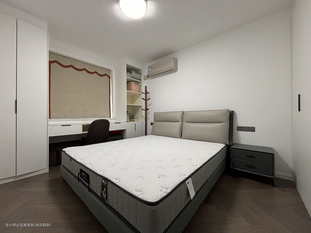 改造前的次卧,颜色沉闷压抑、墙壁老旧泛黄,已经出现了墙体掉落地板上积灰的现象。 - 改造后的次卧,重新布局更为简约,拆除更换新的木地板,窗户也进行了修改,全屋色调一致,整体显得明亮通透。整排衣柜满足收纳需求,增加床头柜方便日常生活动线。 靠窗处打造出悬空式书桌,可以作为学习区、梳妆台、阅读区等使用,以简洁明了的家装布局来最大化的利用空间。 通往卧室的走廊过道处,同样没有做复杂的设计,摆放了一幅挂画做装饰,上方的灯光选择暖色调的灯光,营造温馨的居住氛围。