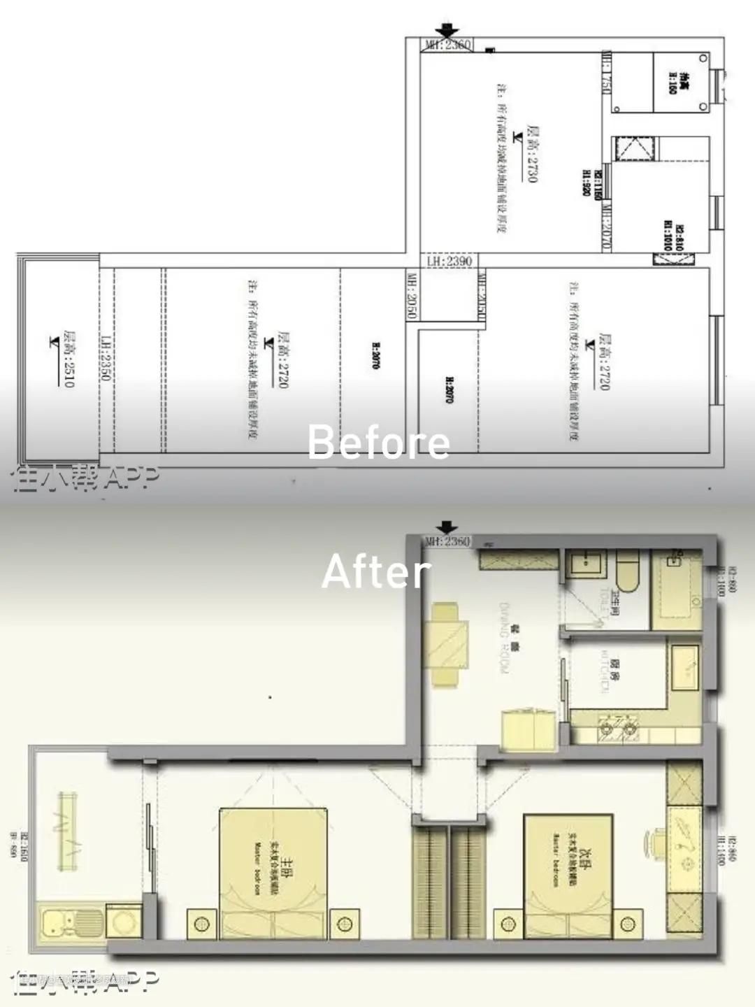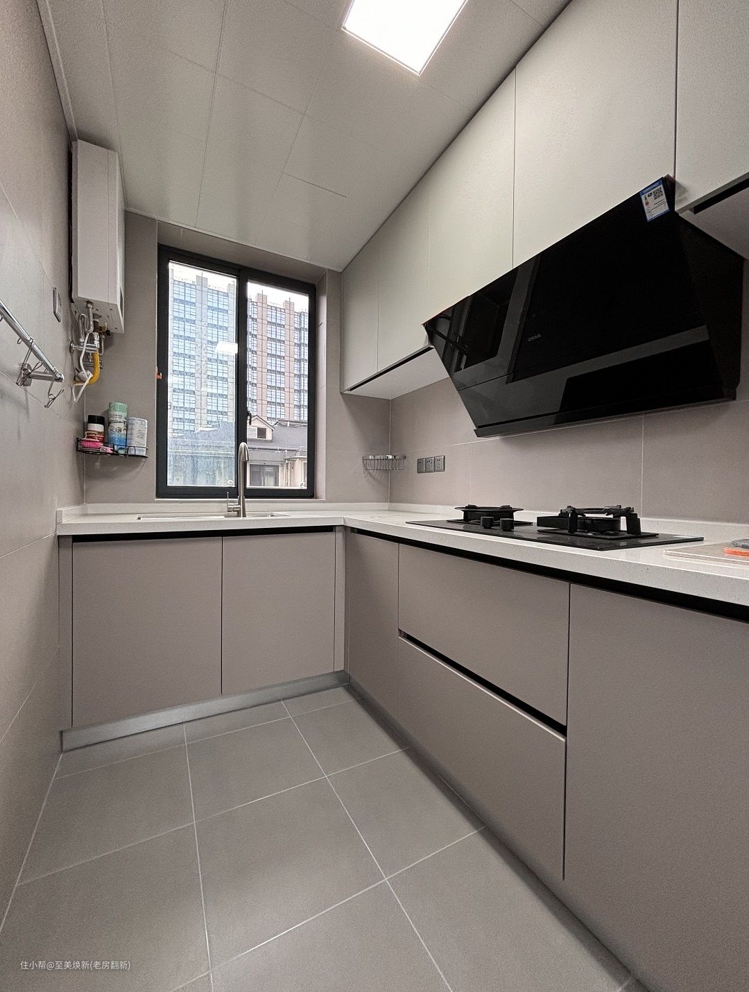 改造前的厨房,狭小拥挤,灶台早已被油烟熏黑,就连上面的瓷砖也破旧不堪,屋内墙面上更是沾满了油污和灰尘,置物和收纳空间完全不足,看上去又脏又旧。 - 改造后的厨房,拆除原有装修,将空间的布局与使用功能完美结合。L形的橱柜布局方案更适合小户型厨房,水槽放短边、中间是操作台,满足厨房洗-切-炒的动线需求,留出1~2人的活动空间,一起做饭不会拥挤。