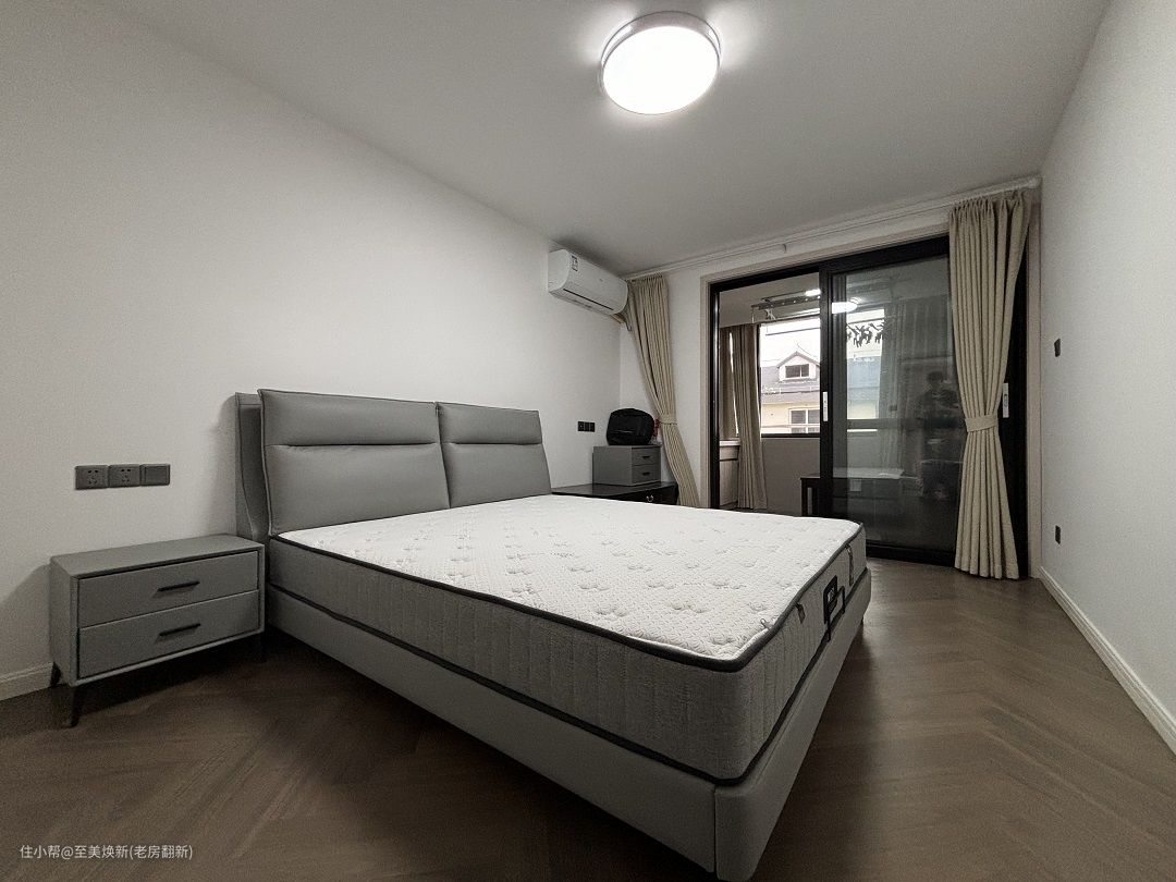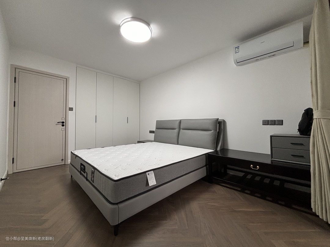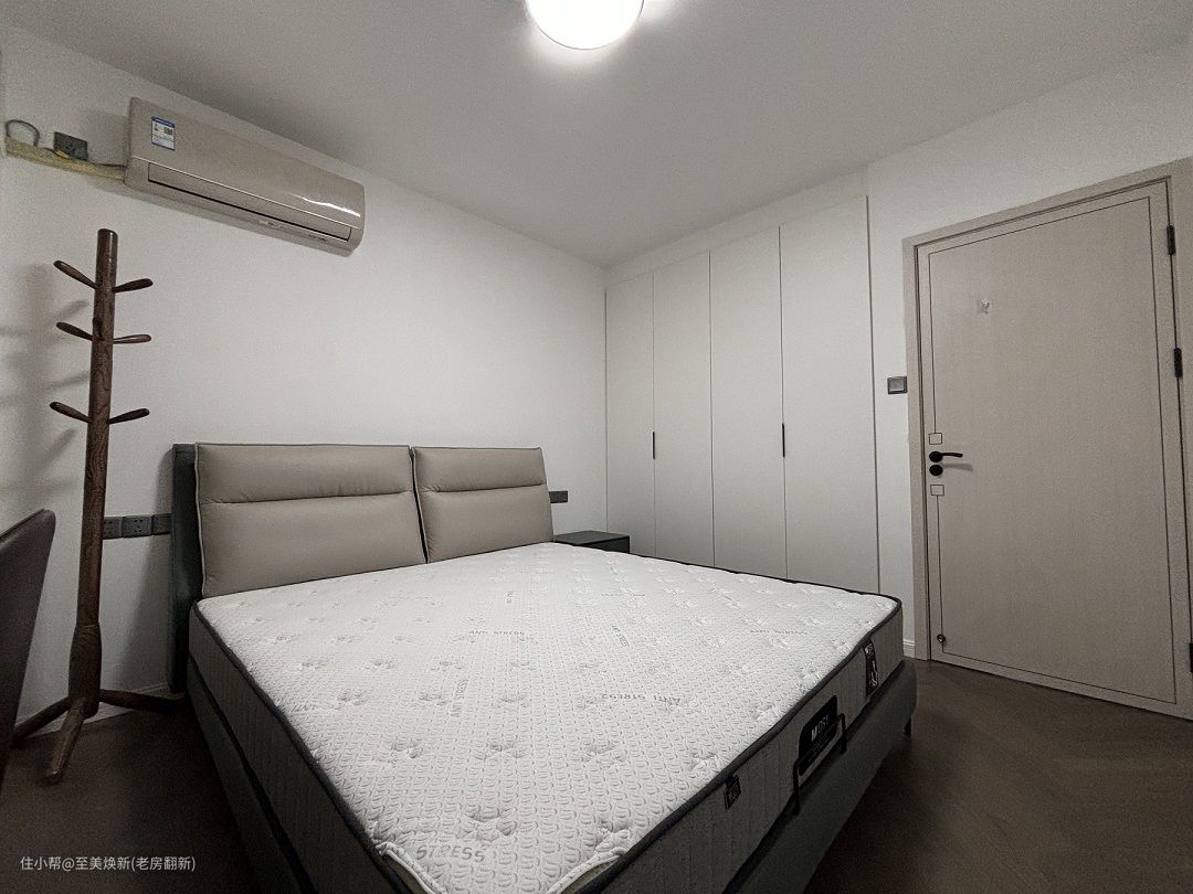 改造前的主卧,整体暗深色的家具风格,采光和空间都受到很大的限制,加上陈旧的装修,显得空间昏暗很多。 - 改造后的主卧,延续整屋格调,温润的木饰面包裹让卧室沉浸在舒缓、闲适的氛围当中。卧室与阳台之间用了一扇推拉门作为隔断,既不影响整体风格,又能提升空间的活力和采光效果。 利用灯光营造氛围感,提升整体的视觉温度,营造舒适安逸的睡眠环境。