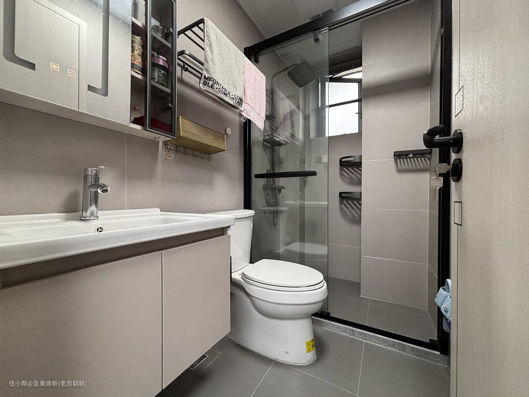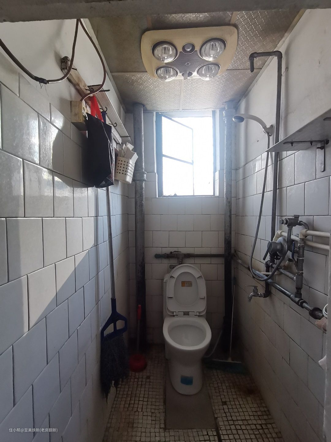改造前的卫生间,没有干湿分离,淋浴只能在马桶边进行,清洁工具只能往墙上挂,不仅拥挤逼仄,还容易发霉和滋生细菌,多处卫生死角更是增加了清洁的难度。 - 改造后的卫生间,进行干湿分离设计,将淋浴与其他区域分隔,并增加浴室柜、镜柜、壁龛等浴室储物功能,让原本闲置的墙面空间得到了利用,满足卫生间干净收纳的需求。